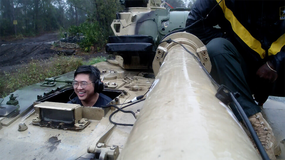 In the back: A gunner and a commander sat inside the turret. There are two additional seats on the top so all three crew members can sit outside facing forwards when it’s safe. It’s also helpful for an instructor to sit on top right beside the driver for training.