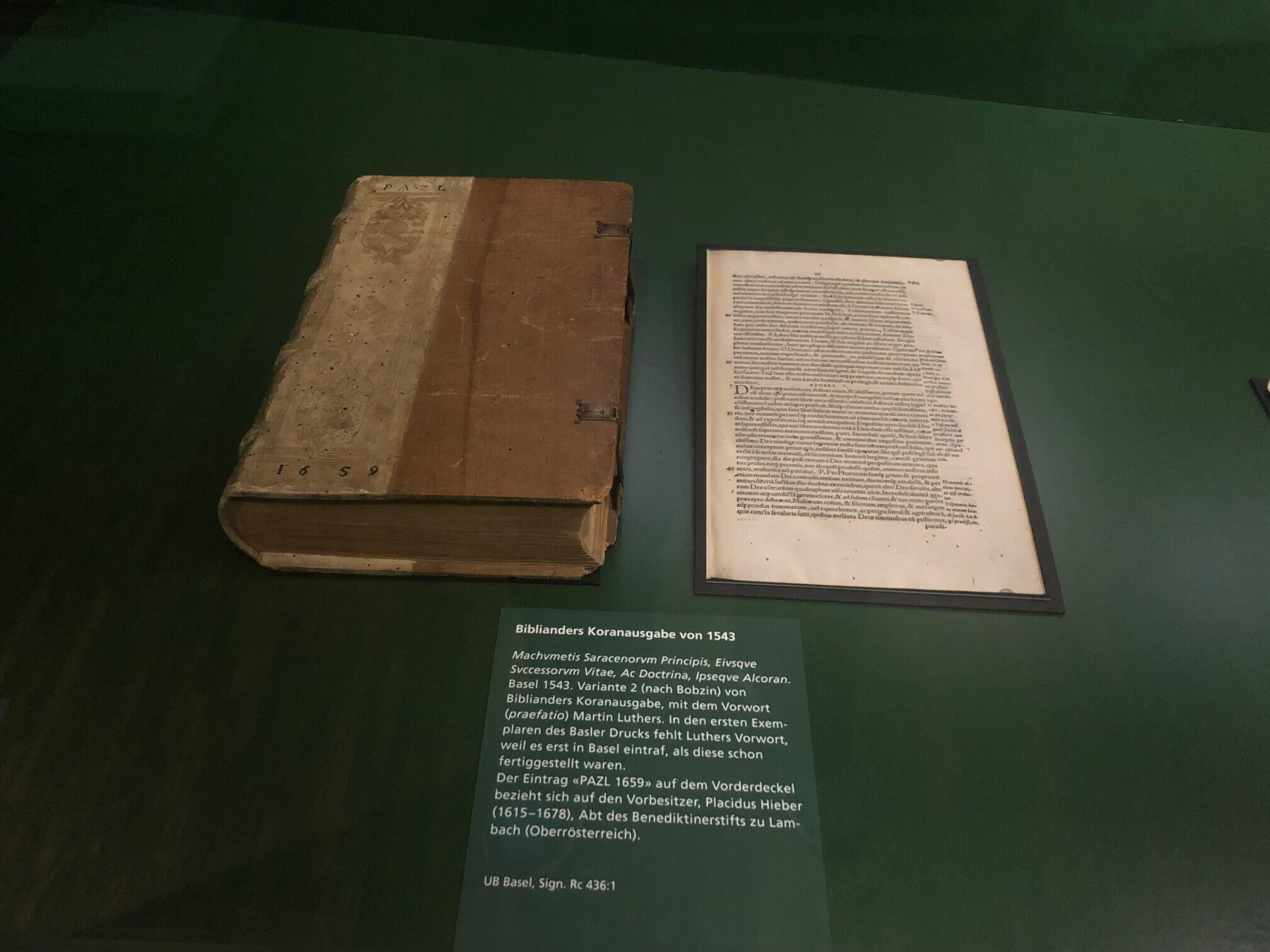 In the underground area of the museum, the world’s first edition of a Koran translated into Latin is displayed as it was printed in Basel. Various pieces of traditional tapestry are displayed on the walls in a dark room to preserve their color. Two original rooms with wooden interiors and their glass windows were also moved into the museum for display to help visitors visualise how people lived back then.