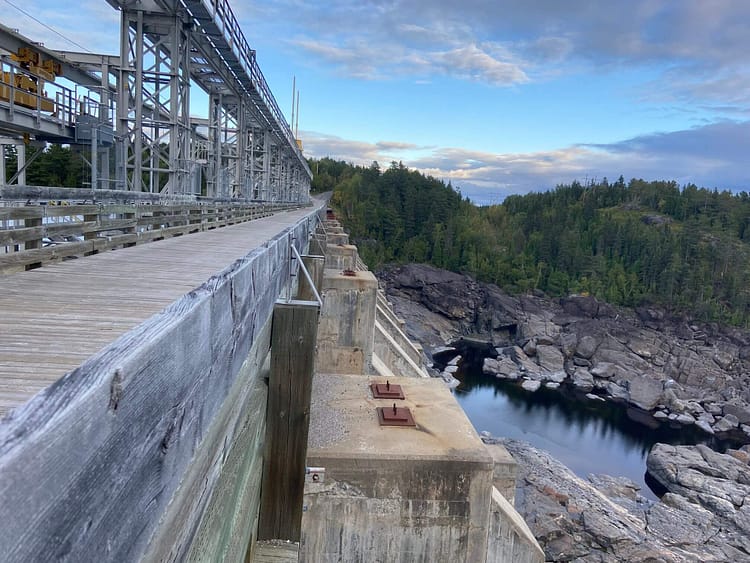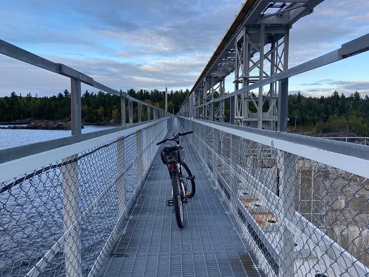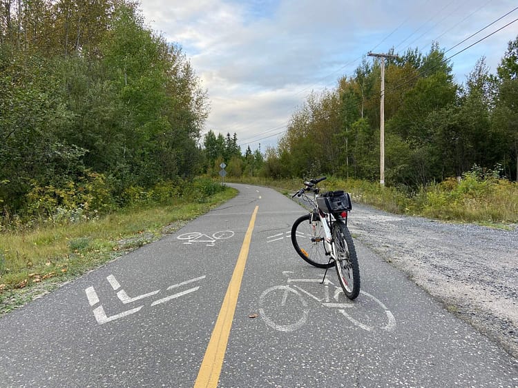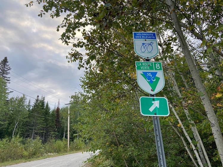 In real life, there’s a lot more land around the lake so it’s not really an obstacle, it’s more of a feature. The Véloroute des Bluets, or roughly the Cycling Trail of Blueberries, circumnavigates the lake and provides two-way bike lanes on most segments except the section that requires a bicycle ferry crossing and dismounting when crossing the narrow dams.