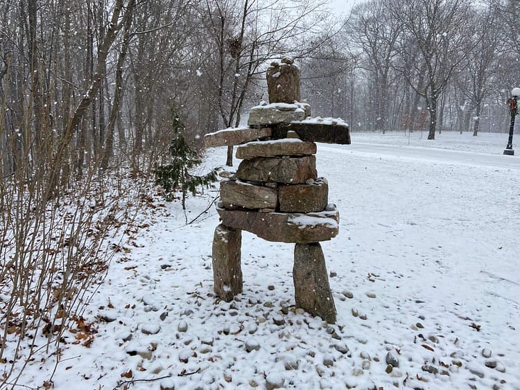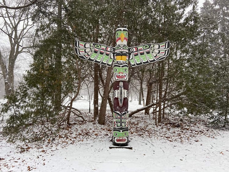 Indigenous elements such as a totem pole featuring several regional animals and a man as well as an Inuit Inuksuk adorn the grounds. The Canadian Heritage Garden is rumoured to be beautiful, but winter and the pandemic have slowed efforts to maintain it this winter.