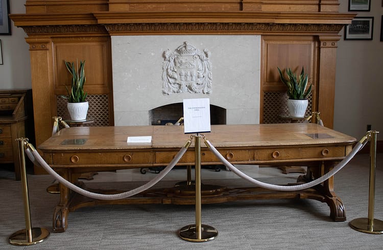 The usual suspects, premiers, monarchs, and speakers are memorialized with paintings on the wall. The former gift shop didn’t see enough foot traffic so it was converted into a photo and art gallery of the building’s construction, renovation and the Queen’s visit in 1986, which was also the year the province finally had a coat of arms. You can also see the Confederation table, where the articles of confederation were negotiated at the 1864 Quebec conference.