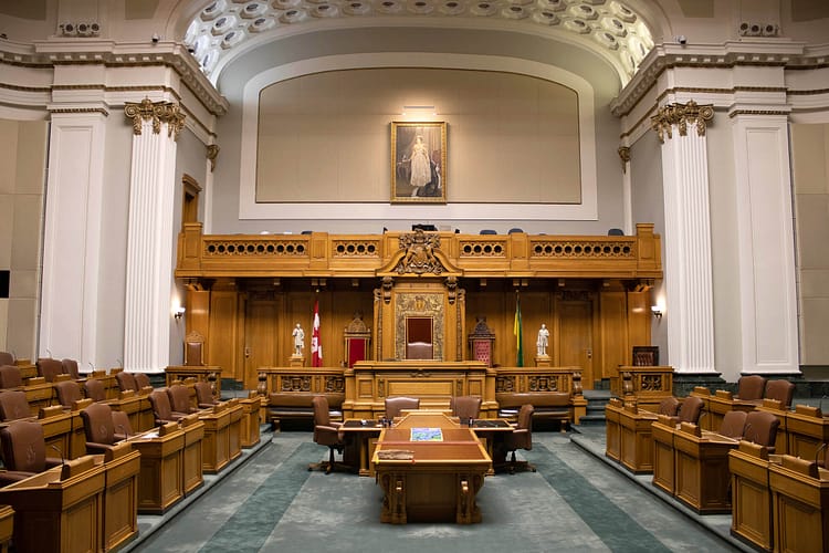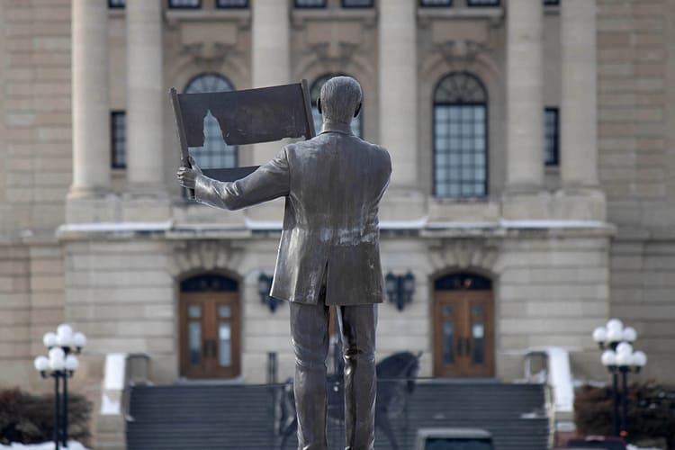 Walter Scott, the first premier of Saskatchewan, hosted a competition for the legislative building to be built in Regina in 1905. The design by the Maxwell Brothers from Montreal was chosen and the building was completed in 1912. It was initially designed to be constructed with red brick before Scott switched to Tyndall stone in the last minute leaving piles of new brick lying around. At $1.75 million, it cost double the original budget.