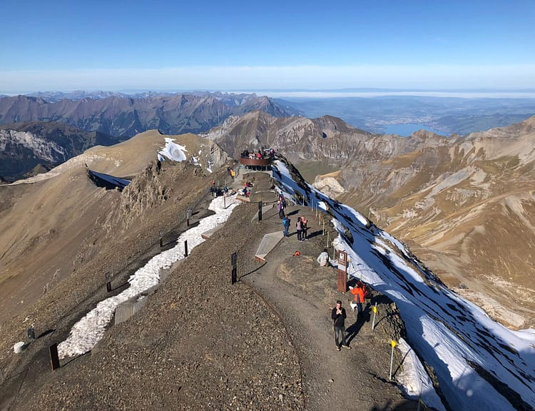 At the top of the Schilthorn, you can see the famous Jungfrau mountain as well as others like the Eiger and the Mönch, Mont Blanc is also visible in the distance on a good day with a visibility of over 80km. The town of Thun and Lake Thun is visible at mid-distance and is close enough to visit in the same day. The weather is mild on sunny days as the rays of sunshine keep you company on the cold peak.