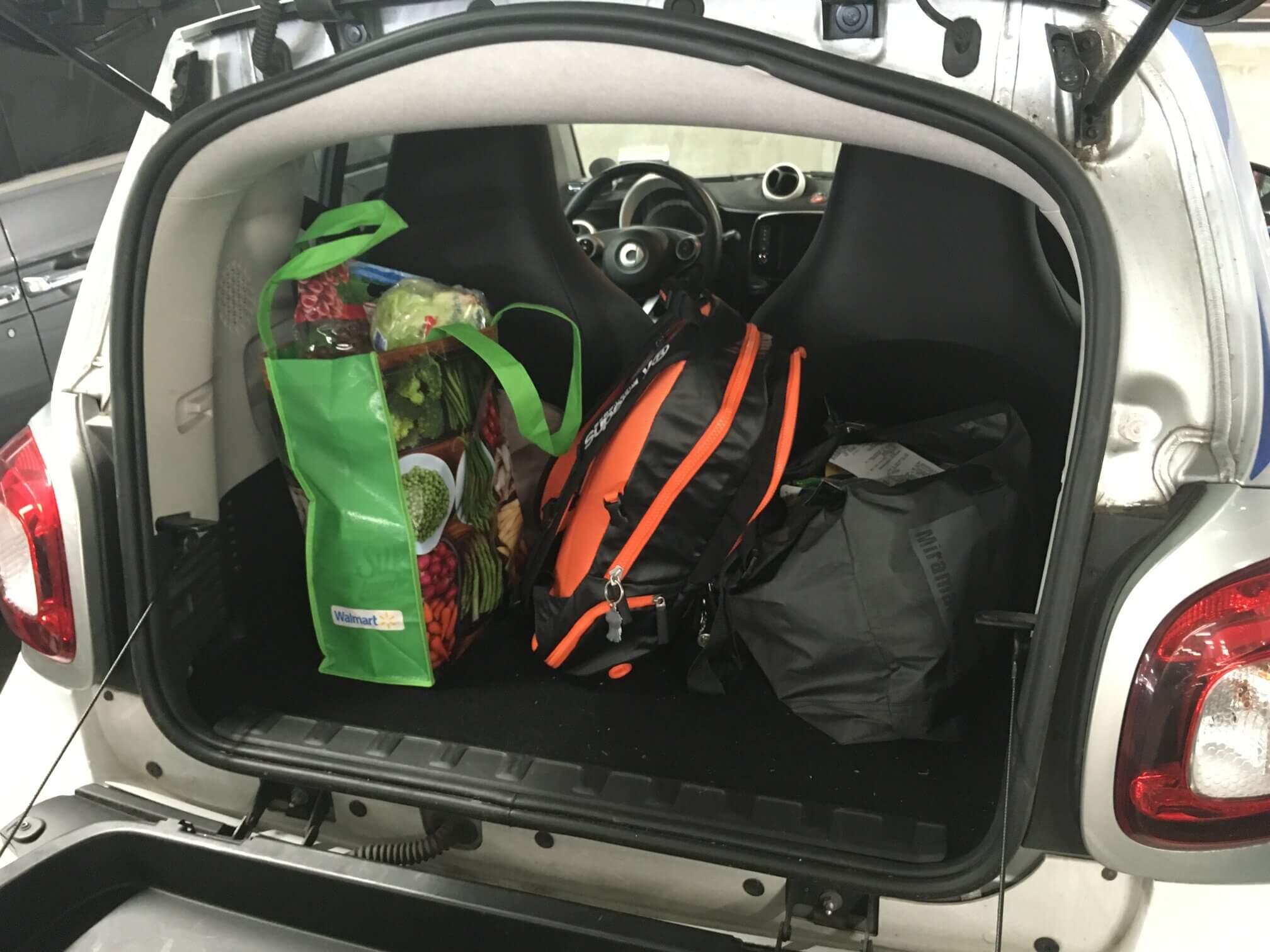 Up front: The first model year of the drastically updated classic Smart by Mercedes-Benz has more room in the passenger compartment. Elbows no longer bump into each other, the gear shifter is no longer too close to my body, and the windscreen is at a comfortable distance from my face. The seats and materials feel like they come from a public bus, but that’s okay, this is the kind of car meant to replace your trips on the public bus.
