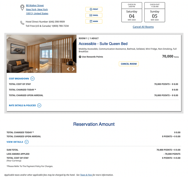 The most expensive room I could get on points was a one queen bed suite on a high floor worth $953 after taxes per night. I tried my luck with the voucher code and it worked! I ended up spending just $227 for three nights in hotels, one each in Florida, Kansas, and New York worth a total of $1,180. This represented 80.2% off the total rate of the three nights.
