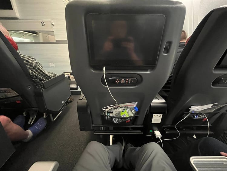 The smaller footwell, though, was the perfect excuse to put my backpack in the overhead bin, so I could stretch out on the red-eye flight. I managed to sleep a total of two hours, waking up just once in between.