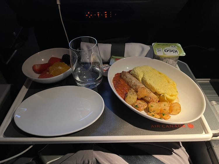I had flown on this exact flight on the exact plane six days prior, so I know the breakfast options are exactly identical to business class, as is the wine list. I had Air Canada’s iconic parsley omelette with a turkey sausage and homestyle potatoes. While airlines like Air France make their premium economy a larger seat with economy class amenities, it’s good to see Air Canada offering business class-quality meals in both cabins.