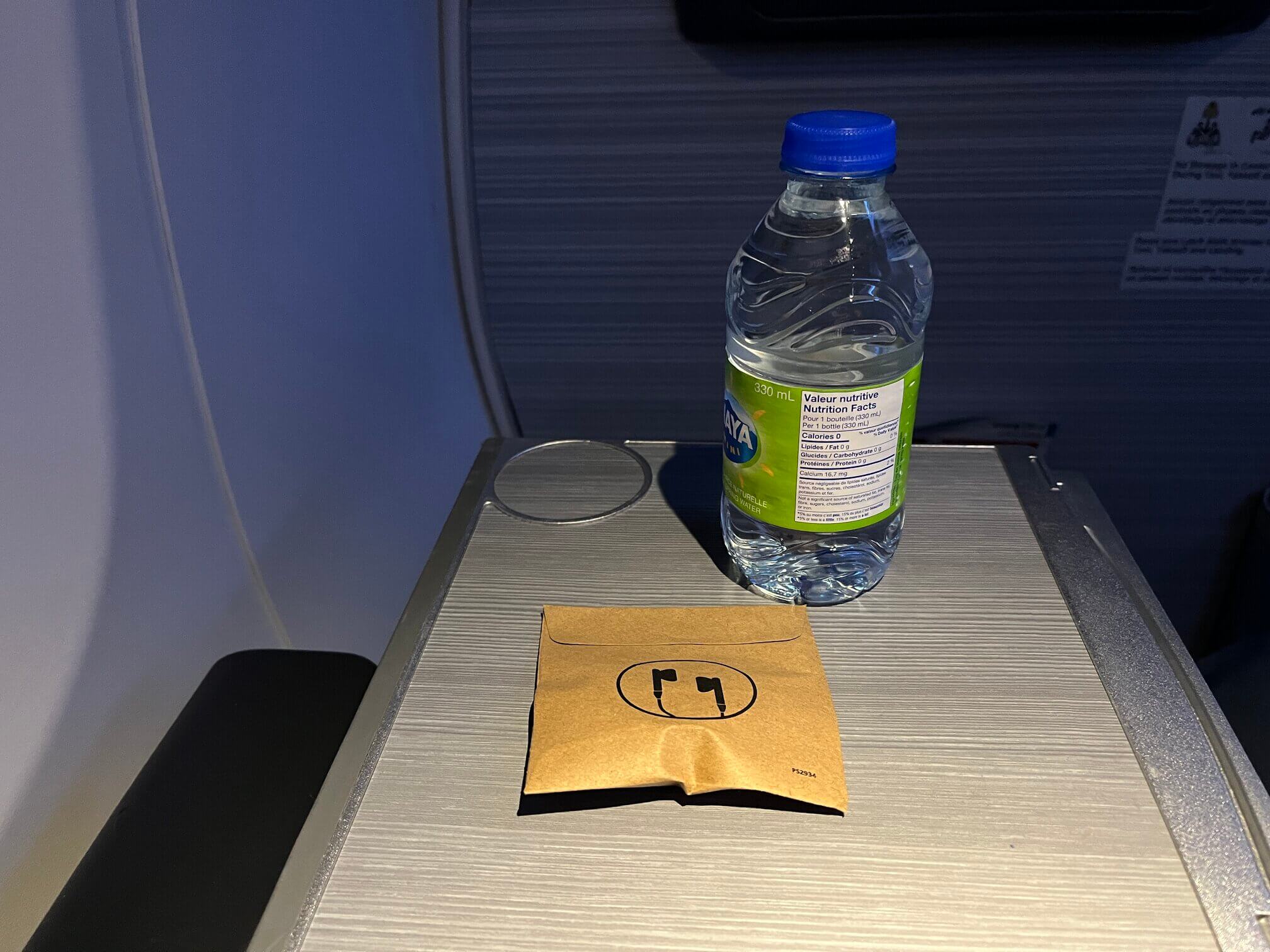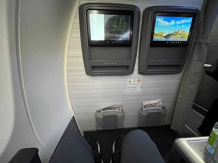 The screen at the bulkhead isn’t within arm’s reach, so if you plan on watching movies you should pick one of the rows behind. The left side also has a narrow bulkhead than the right side, so the screens offset from seat 1C. I didn’t watch anything on the short hop as I wouldn’t be able to finish anything anyway. Earbuds are included for business class passengers.