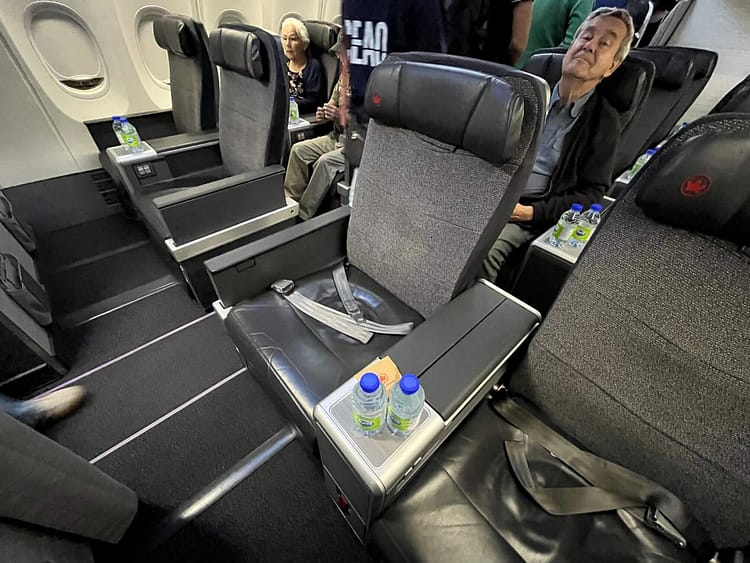 The standard North America Business Class seat has generous seat pitch and width. I’m overweight and can fit both my arms inside the armrest. The B737 has wider middle armrests than the A220, so a whole bottle of water can fit into the laptop compartment. The leg rest is a welcome comfort in addition to the steep recline. The adjustable headrest also has wings to stop your head from rolling around while sleeping.