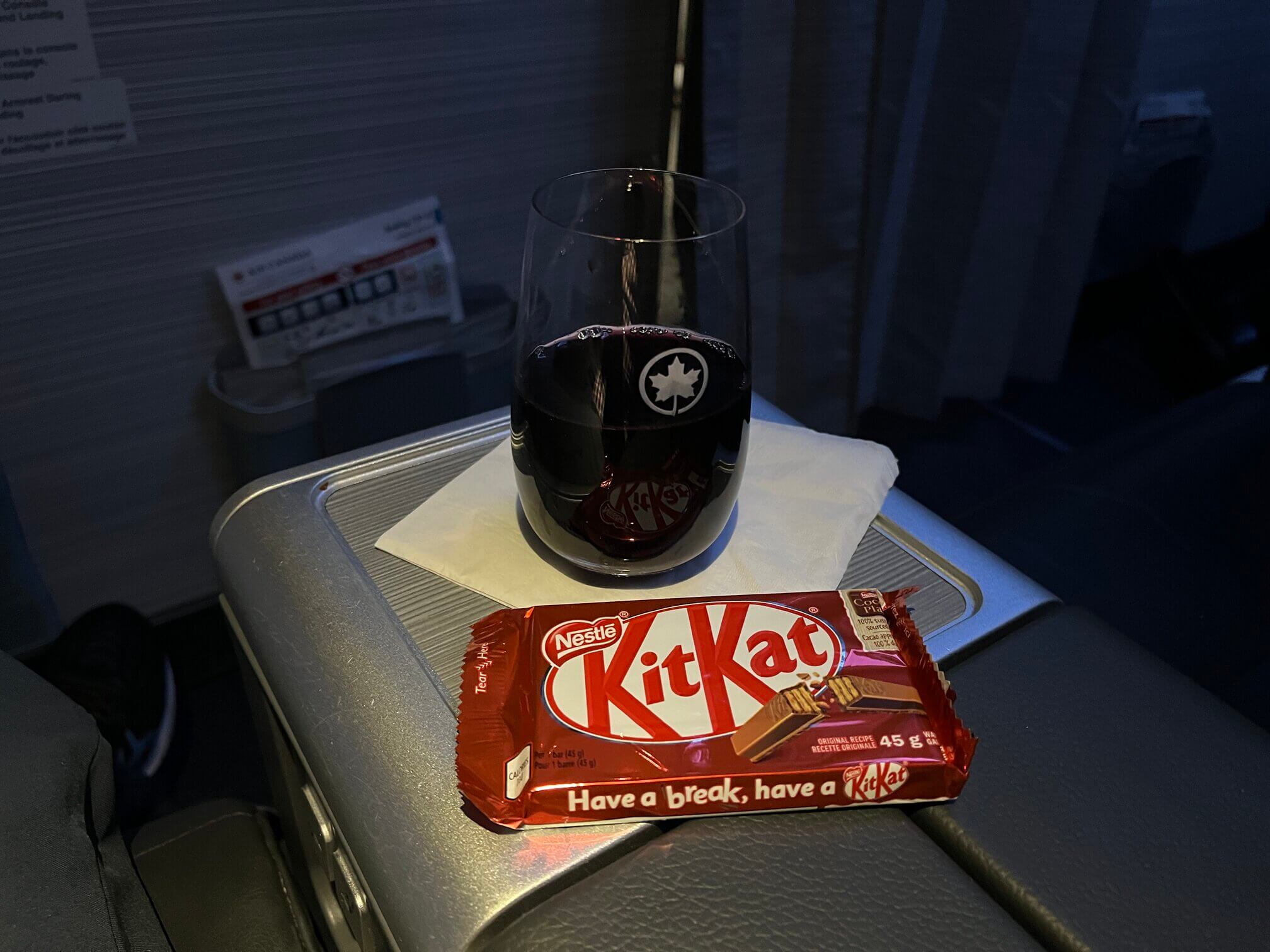 Flights under an hour only get a snack service and drinks. Passengers could choose between premium crisps, chocolates, and larger bags of the same pretzels distributed in economy. I had a KitKat and a glass of Cotes du Rhône.