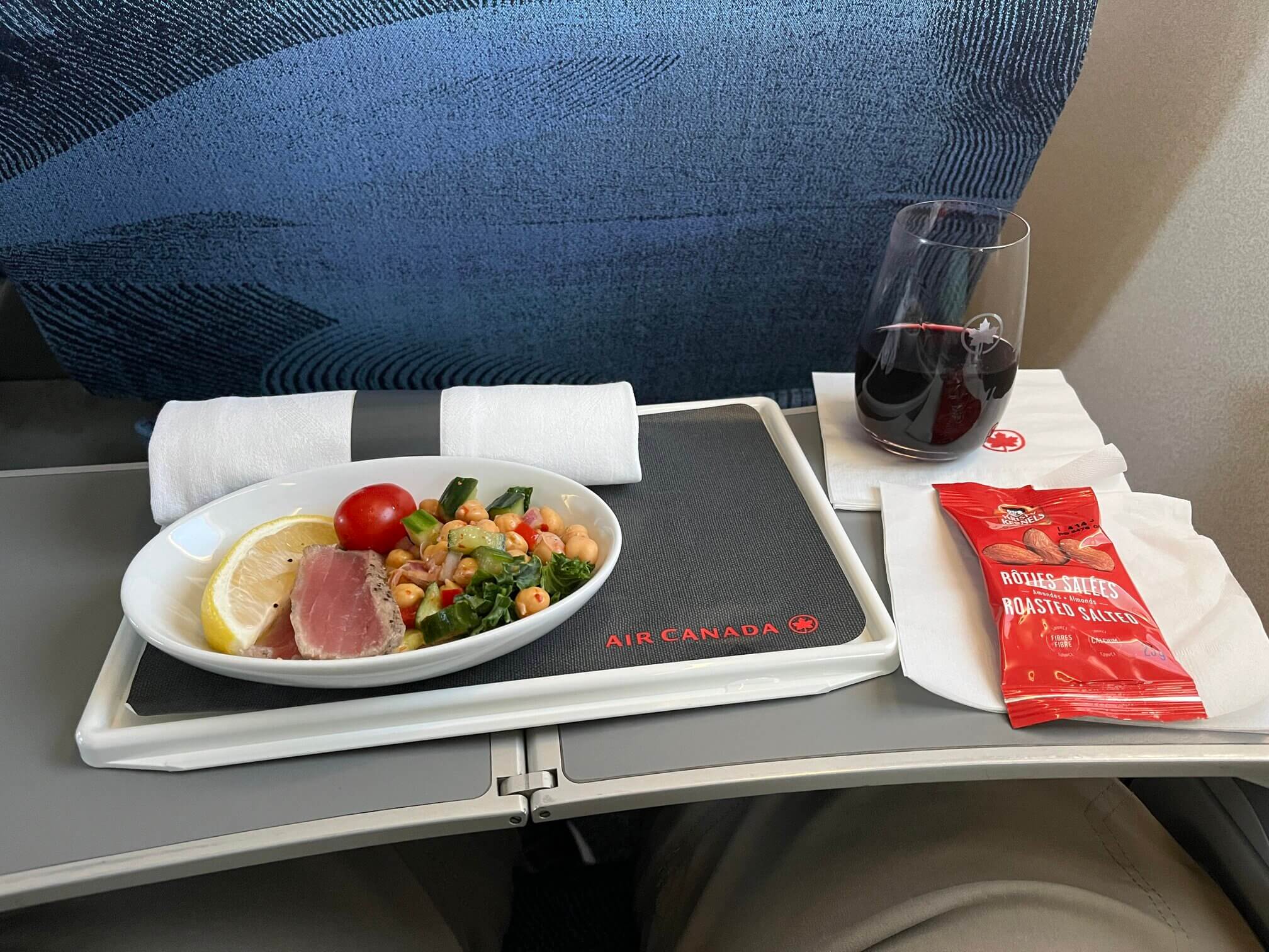 Bottled water was served upon boarding. The short flight only had a snack, which was served on chinaware with metal cutlery. The tuna tataki salad would have been an appetizer of a three-course meal on a flight two hours or longer. It was delicious and I was offered as much wine and nuts as I wanted.