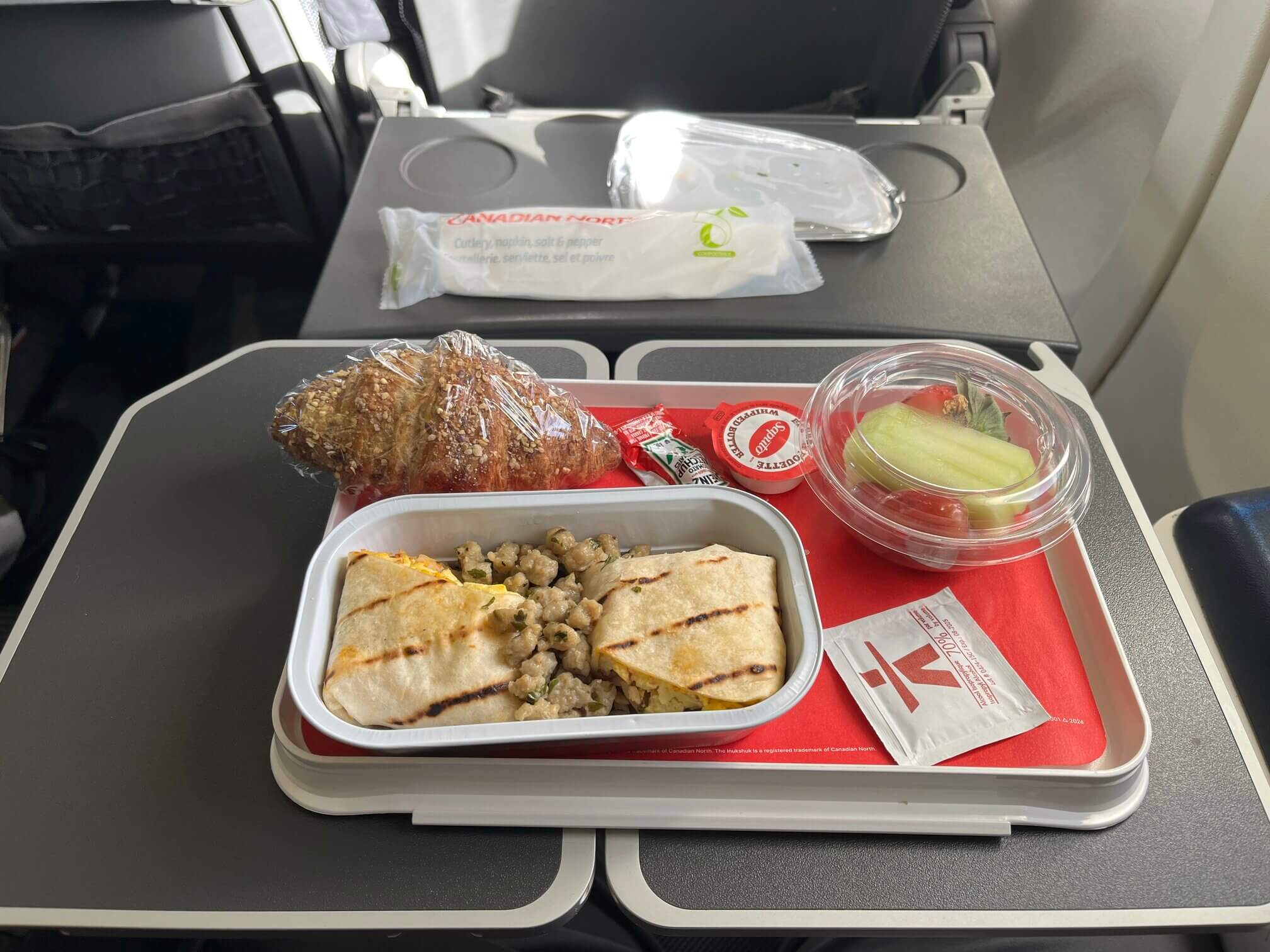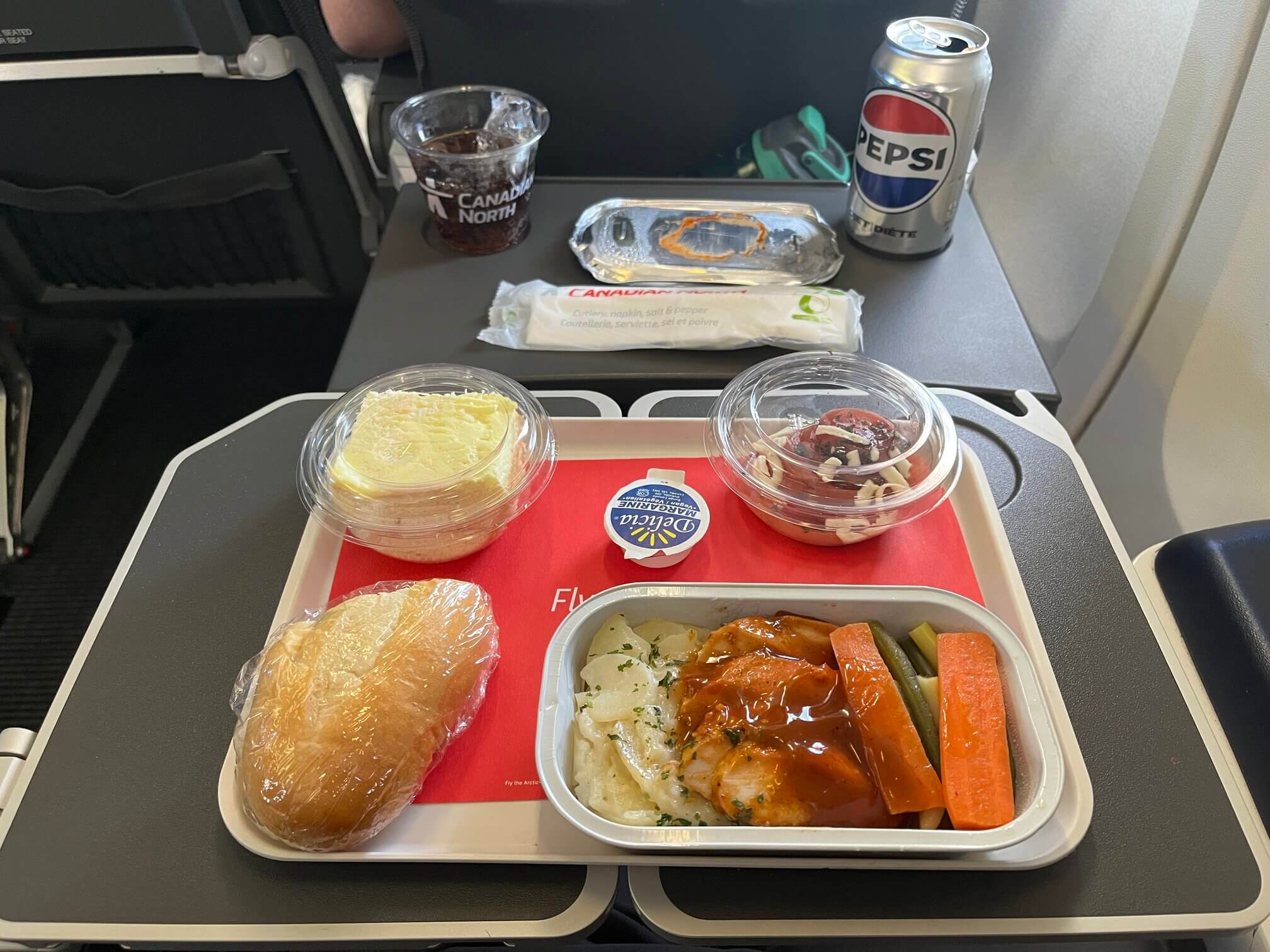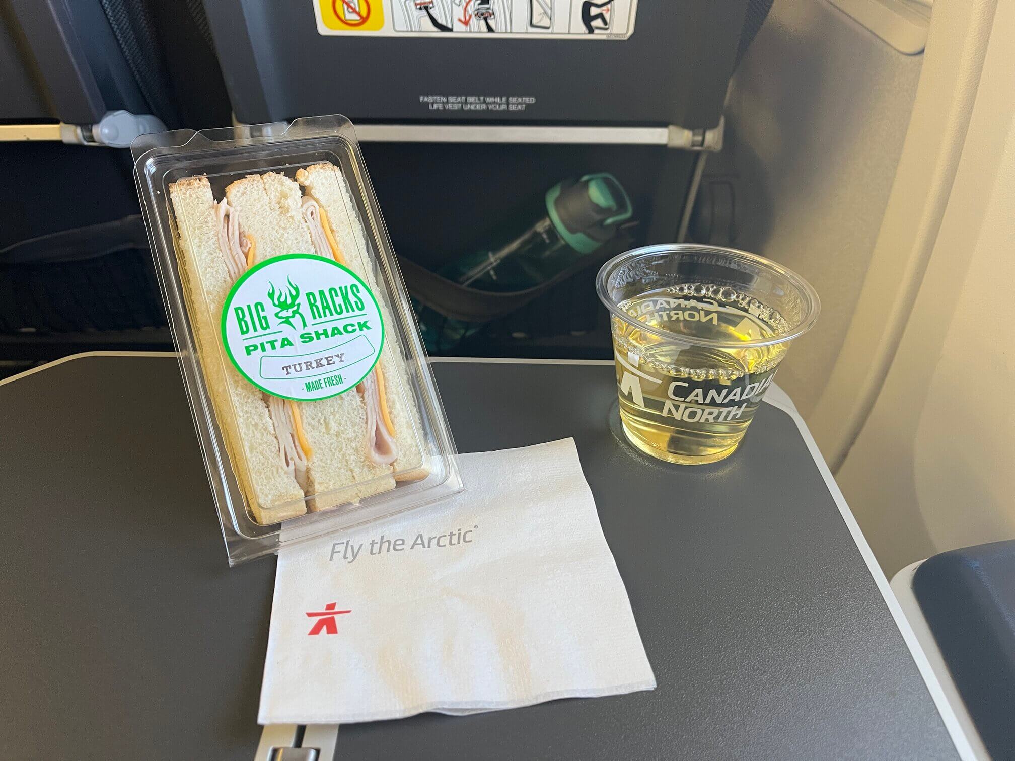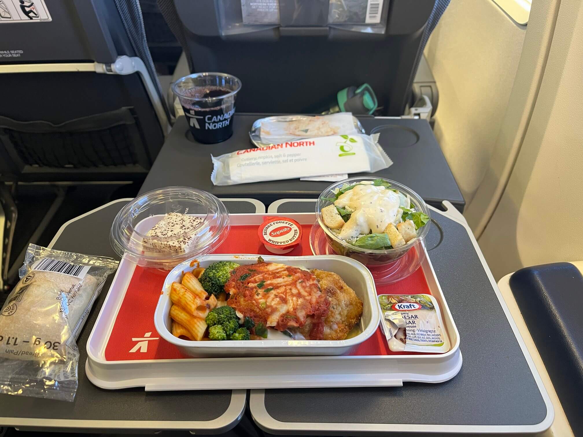 Canadian North has resumed meal service on its flights in 2022, so each leg of the flight comes with a meal. The Ottawa to Iqaluit leg comes with a hot burrito or cold overnight oats breakfast, the intra-territorial flight to Rankin Inlet had free wine and a turkey and cheese sandwich, the onward flight to Yellowknife was a dinner choice between vegetarian pasta or chicken parmesan, and the final leg to Edmonton was vegetarian ravioli or chicken with scalloped potatoes.