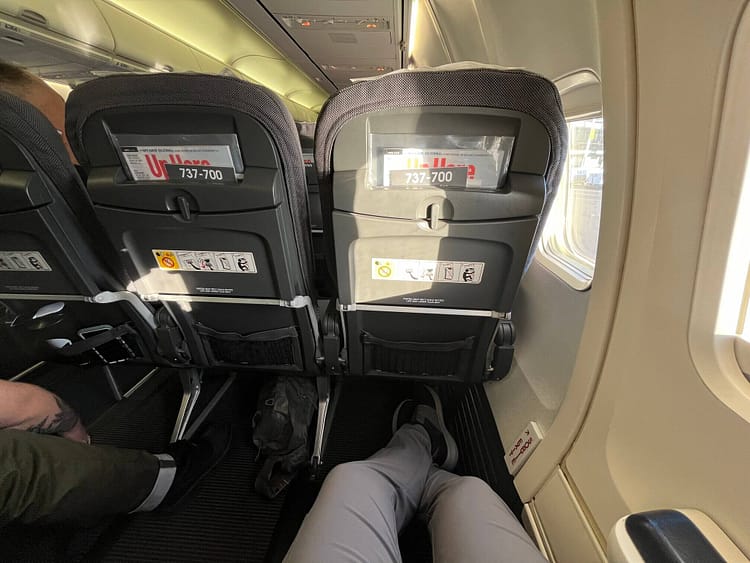 However, after a last-minute equipment swap away from a combi, I was reassigned to exit row seat 11F on a B737-700. Exit row passengers have the luxury of two tray tables—one in the armrest and one on the seat back in front. The flight was empty enough that nobody sat in the middle seat of the three-by-three arrangement. While I had plenty of elbow room, the window side of the emergency exit row is missing a full armrest. The emergency exit handle cover was loose, so it rattly at takeoff and landing.