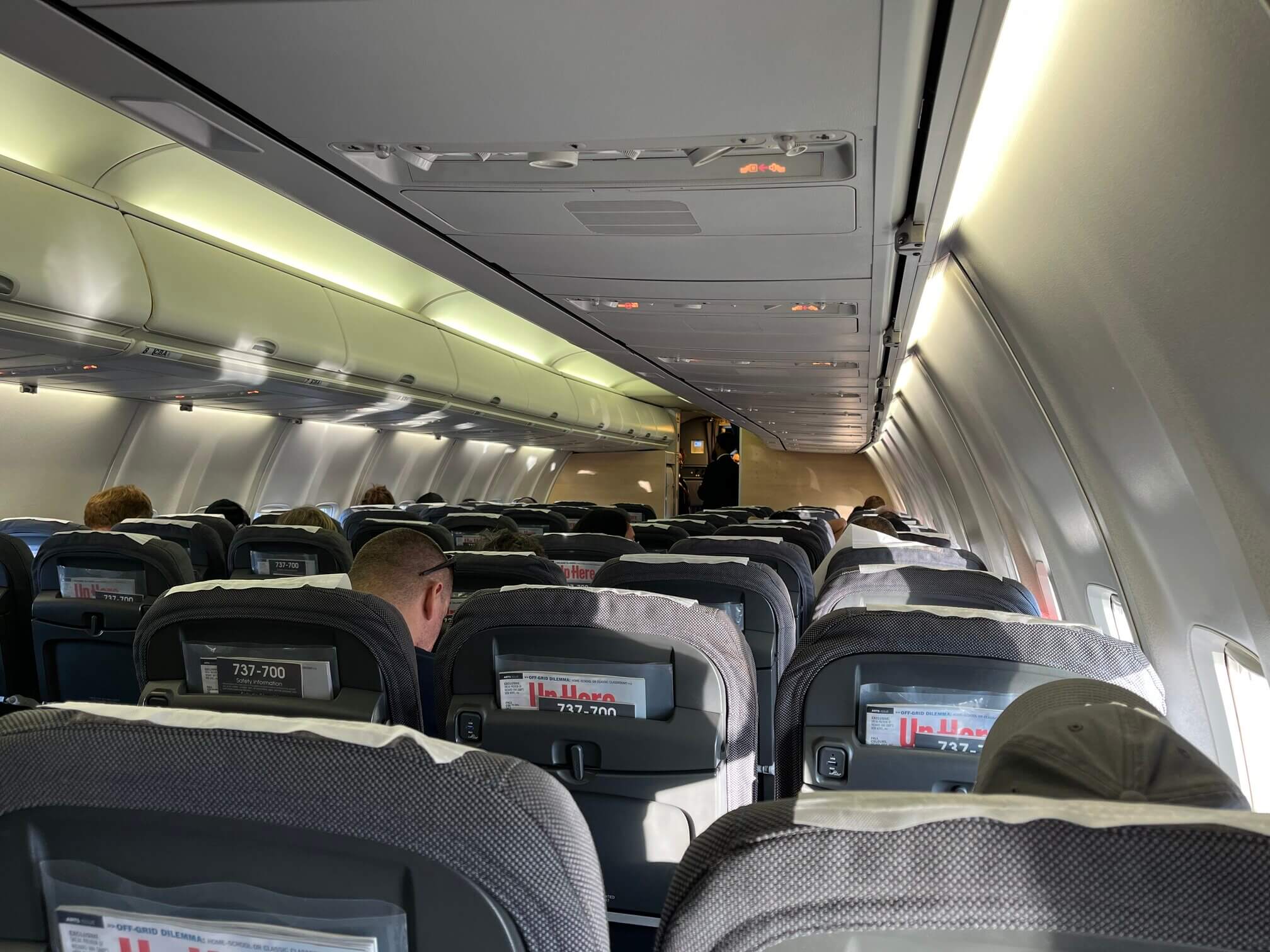 There are two USB-A ports for every three seats located under the middle armrests at exit and bulkhead rows and one USB-A port per seat at most other rows. Unlike older Air Canada planes, the USB ports work. With a low passenger load, each person could have one port. Without a screen or internet, the only in-flight entertainment is the bi-monthly Up Here magazine in the seat back pocket. I thought it was a smart move to buy an existing regional magazine rather than to shoulder the expense of a bespoke in-flight magazine.