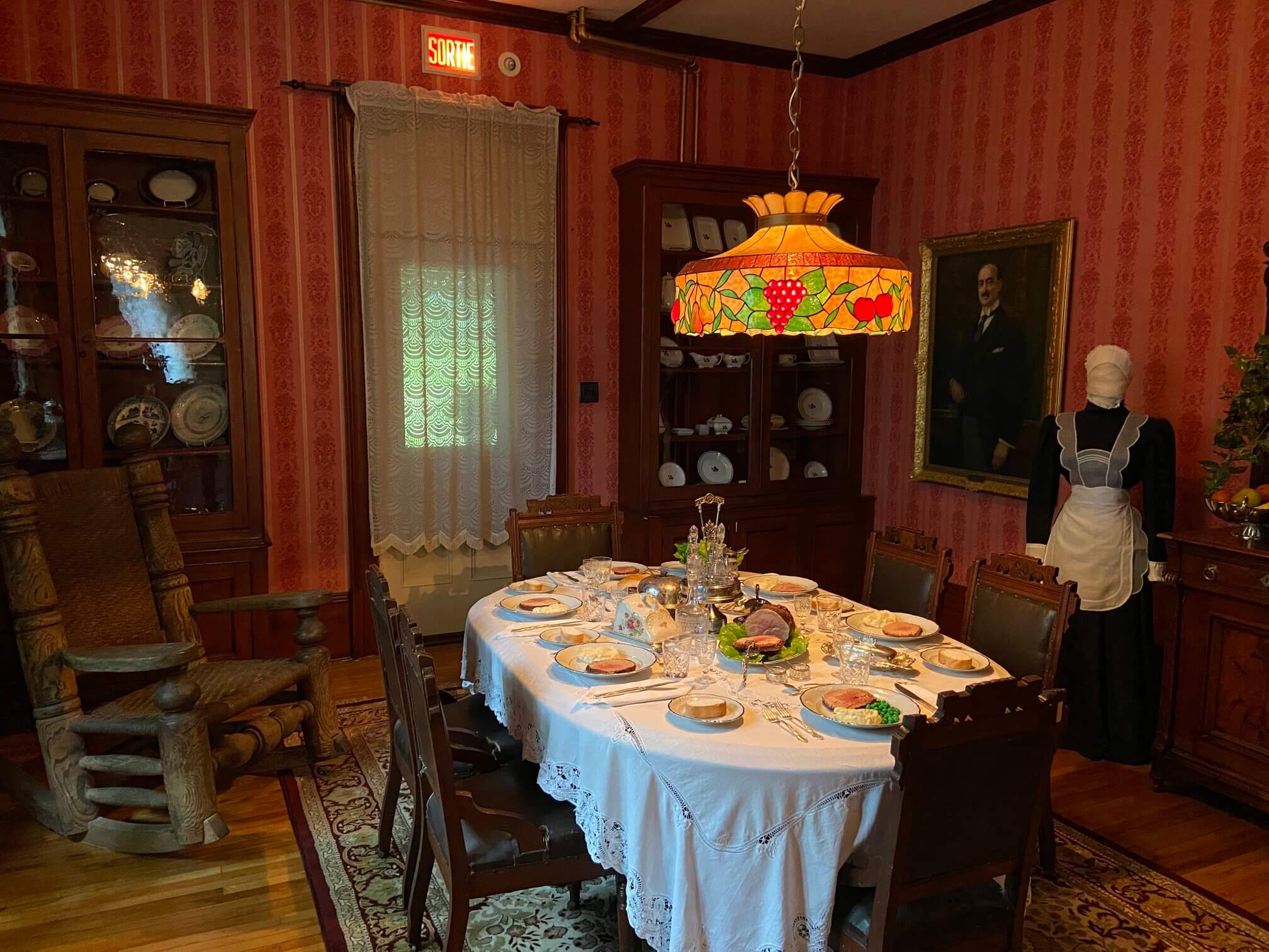 In the living room is a painting by Suzor-Côté who also lived in Arthabaska. The painting titled La Bénédiction des érables depicted an annual tradition of a blessing of maple trees for plentiful maple syrup harvest. Back then, containers were placed on the ground to collect the sweet sticky stuff.