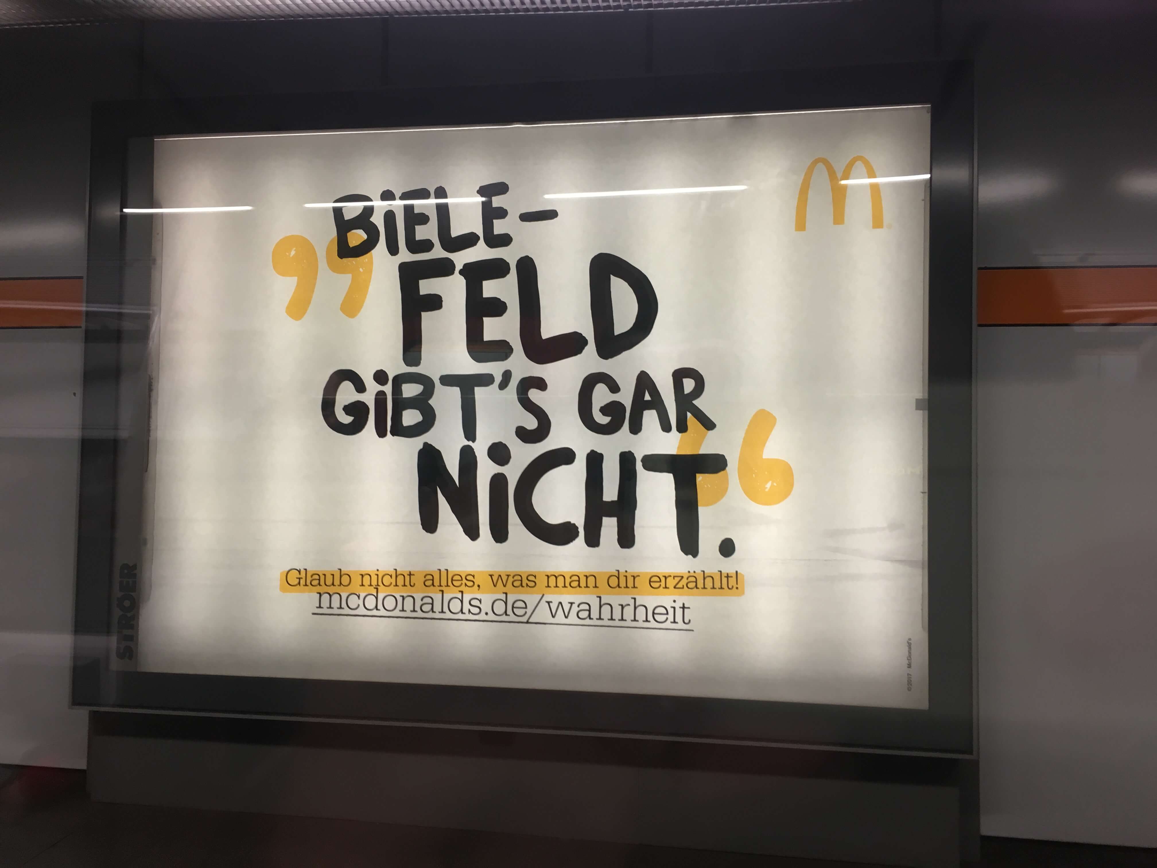 If the answer to all three questions are ‘no’, then you really can’t be sure if it exists or not. The phrase: “Ich gibt es gar nicht” can mean “I do not believe it” (I don’t believe you are from Bielefeld) or “it does not exist” (I don’t believe Bielefeld exists). McDonalds has even capitalised on this joke in their German advertising campaign on low prices reading: “Bielefeld gibt’s gar nicht” (Bielefeld does not believe it).