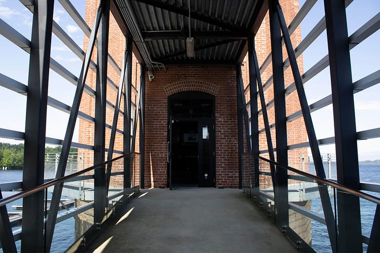 Underground, there’s a water pump exhibit. Outside, there’s a water tower and an interpreted viewpoint too look out to a marina where wood once floated awaiting processing into paper pulp.
