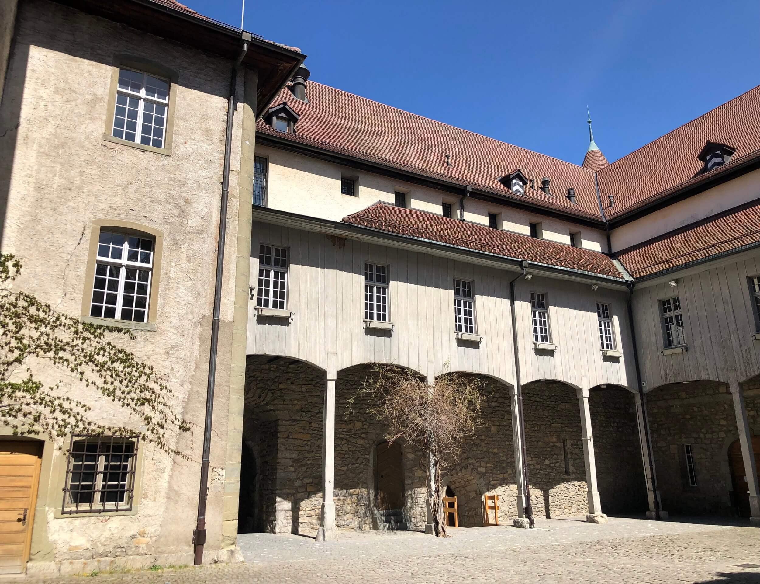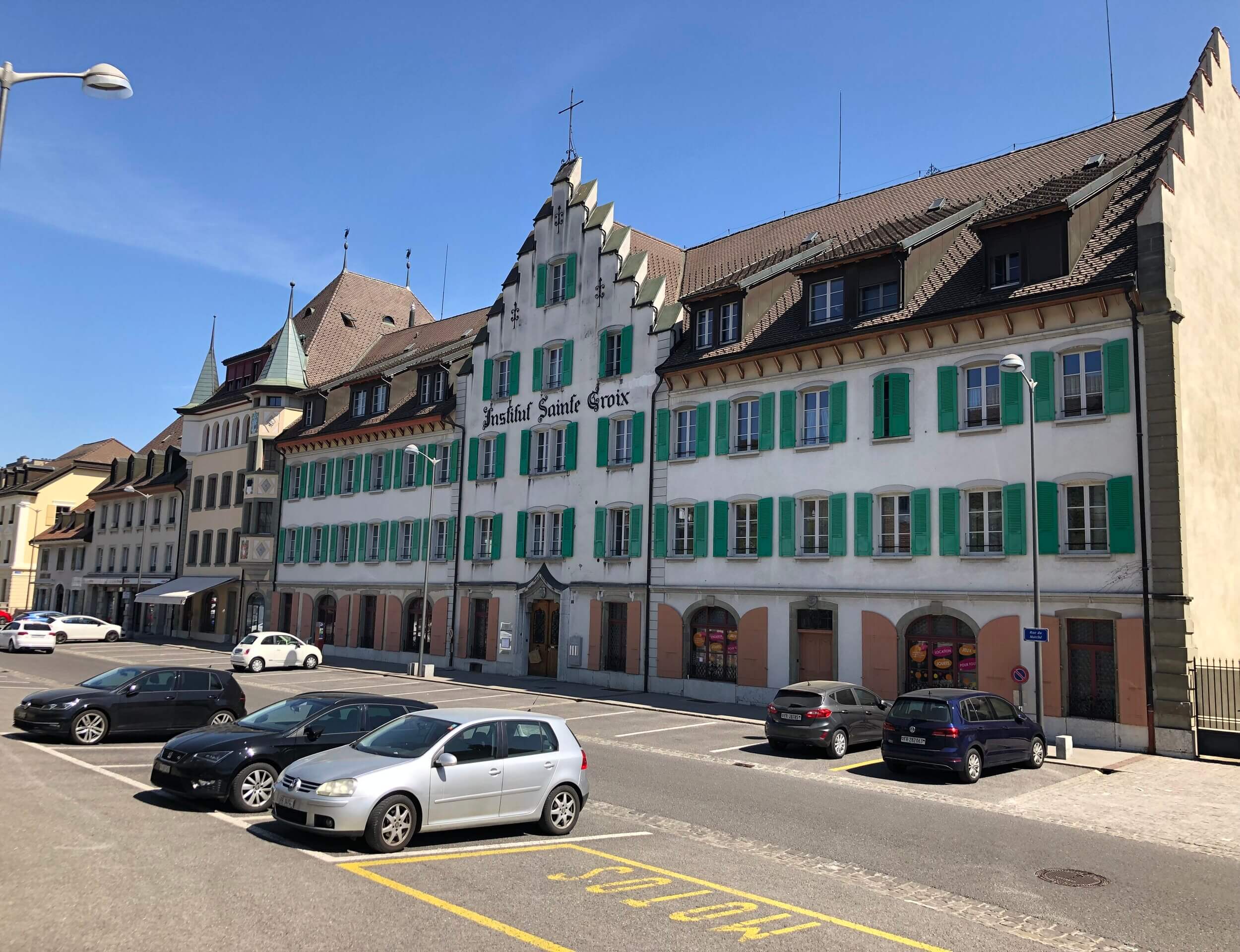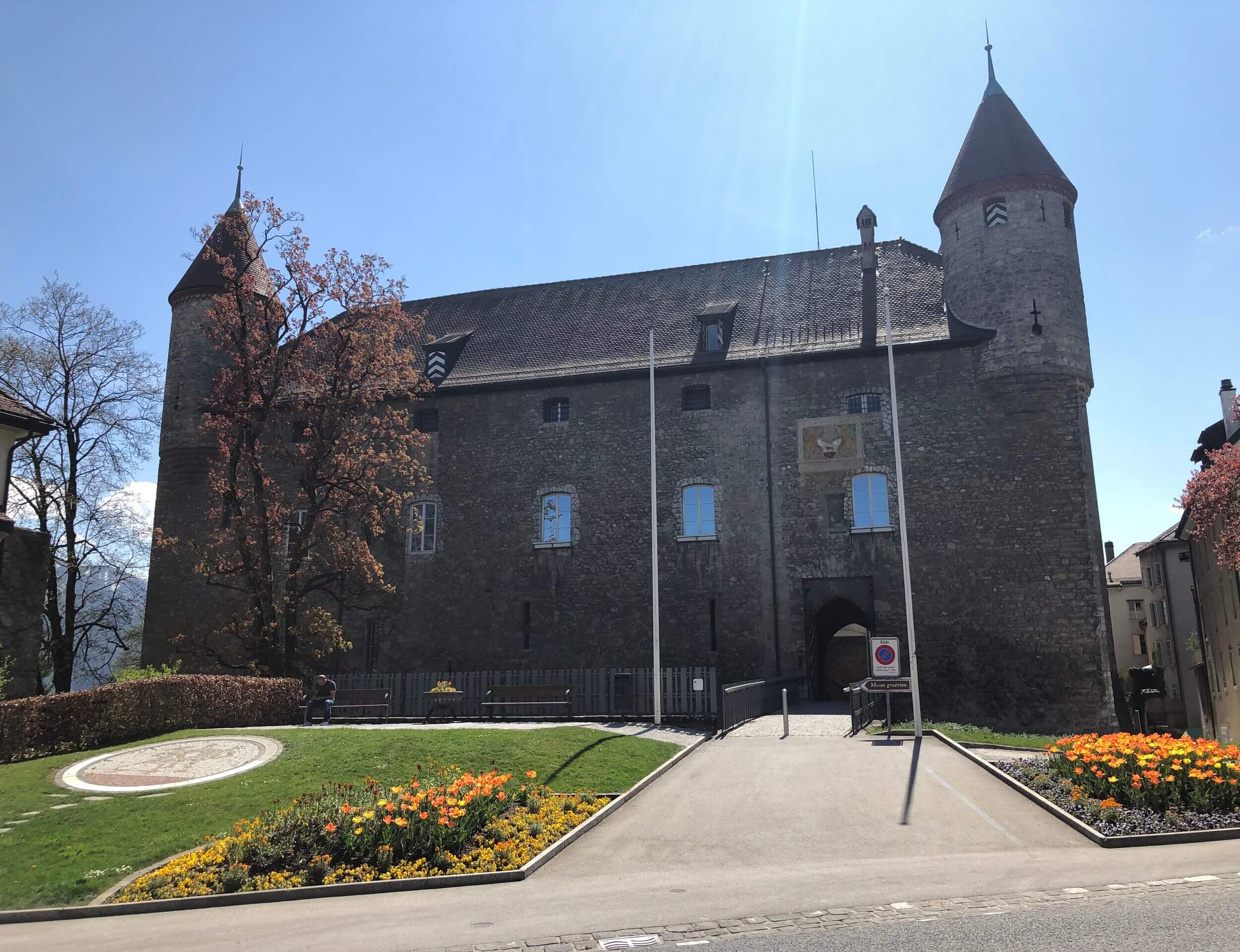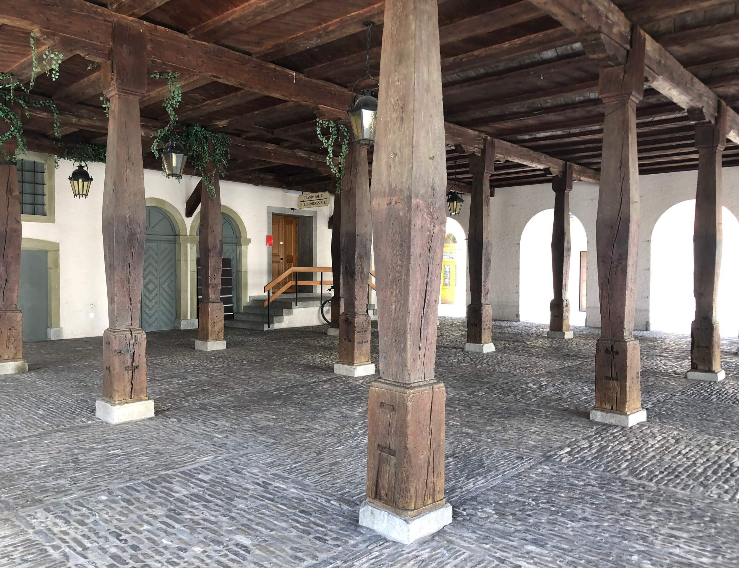 The market place is where cows and produce used to be traded centuries ago, it is now a municipal parking lot when not used as an event space. The market place is the centre of town with the Chapel of Our Lady of Compassion and the Baillival Castle, more commonly known as the Bulle Castle, around its edges.