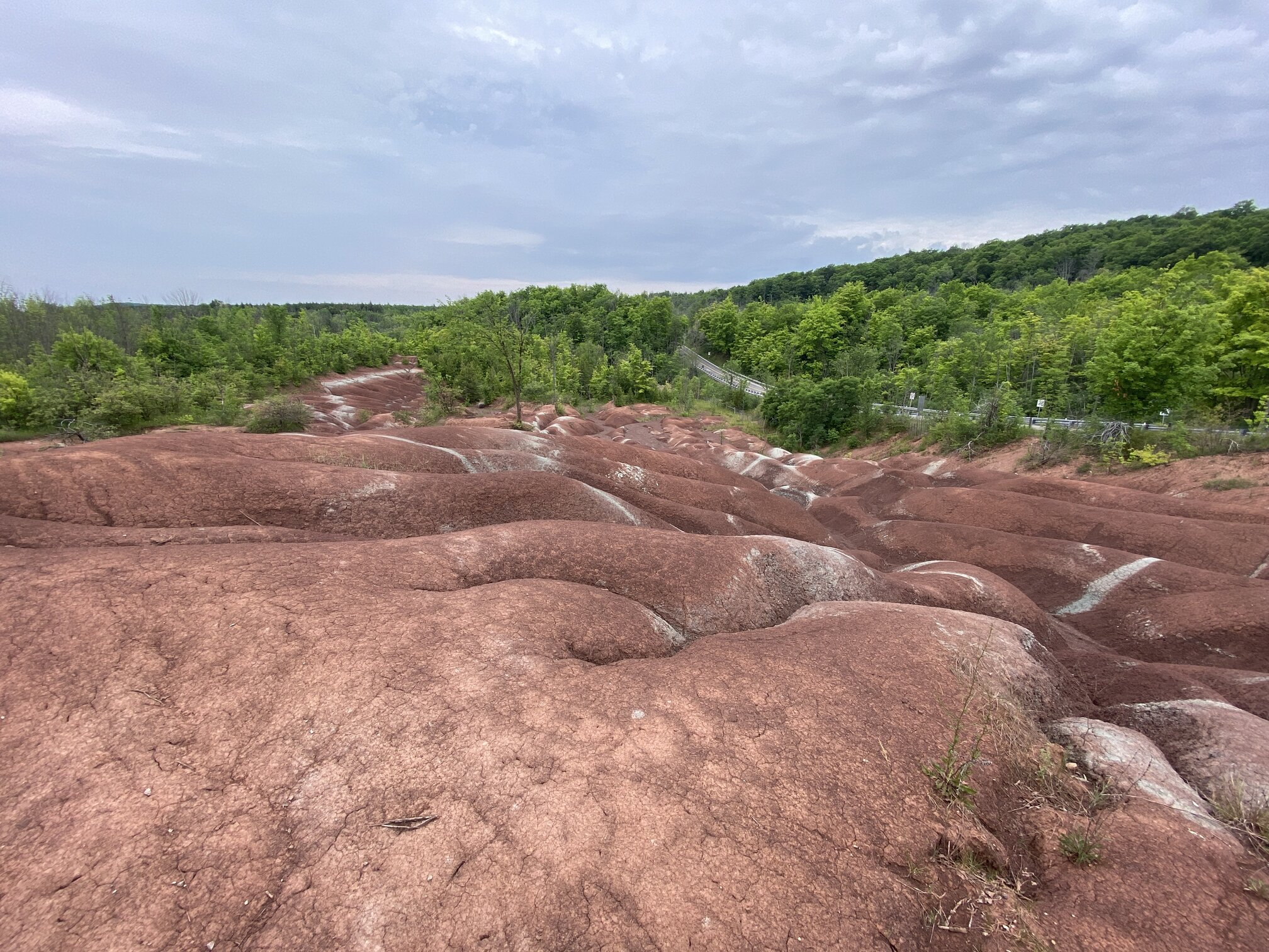 Geologically similar to the Badlands of South Dakota, the Cheltenham Badlands are a lot smaller in scale. They are a swath of Queenston Shale with layers of siltstone and sandstone. When it was formed, the land was under water. Circulating water helped form the grey streaks in the rock.