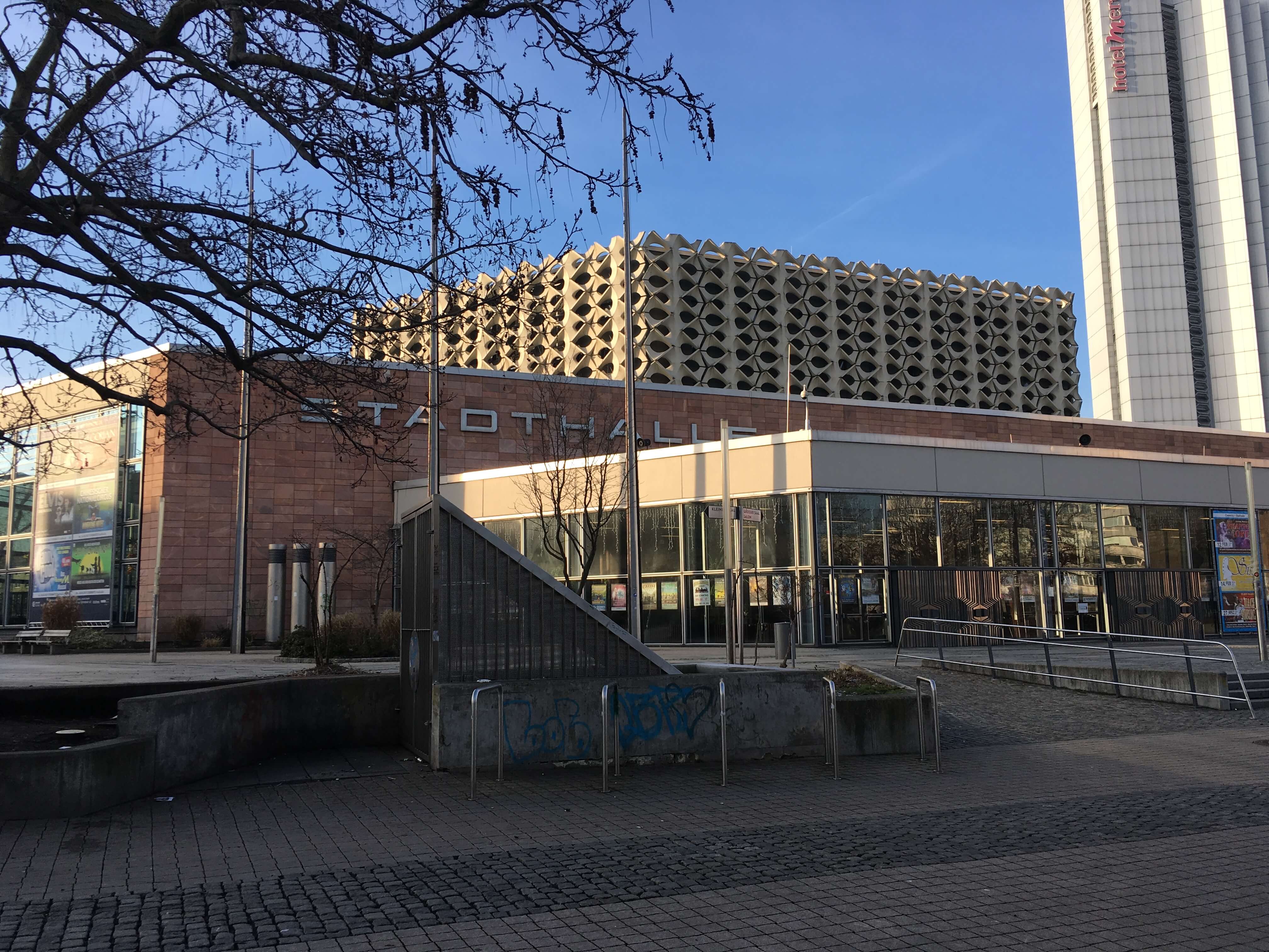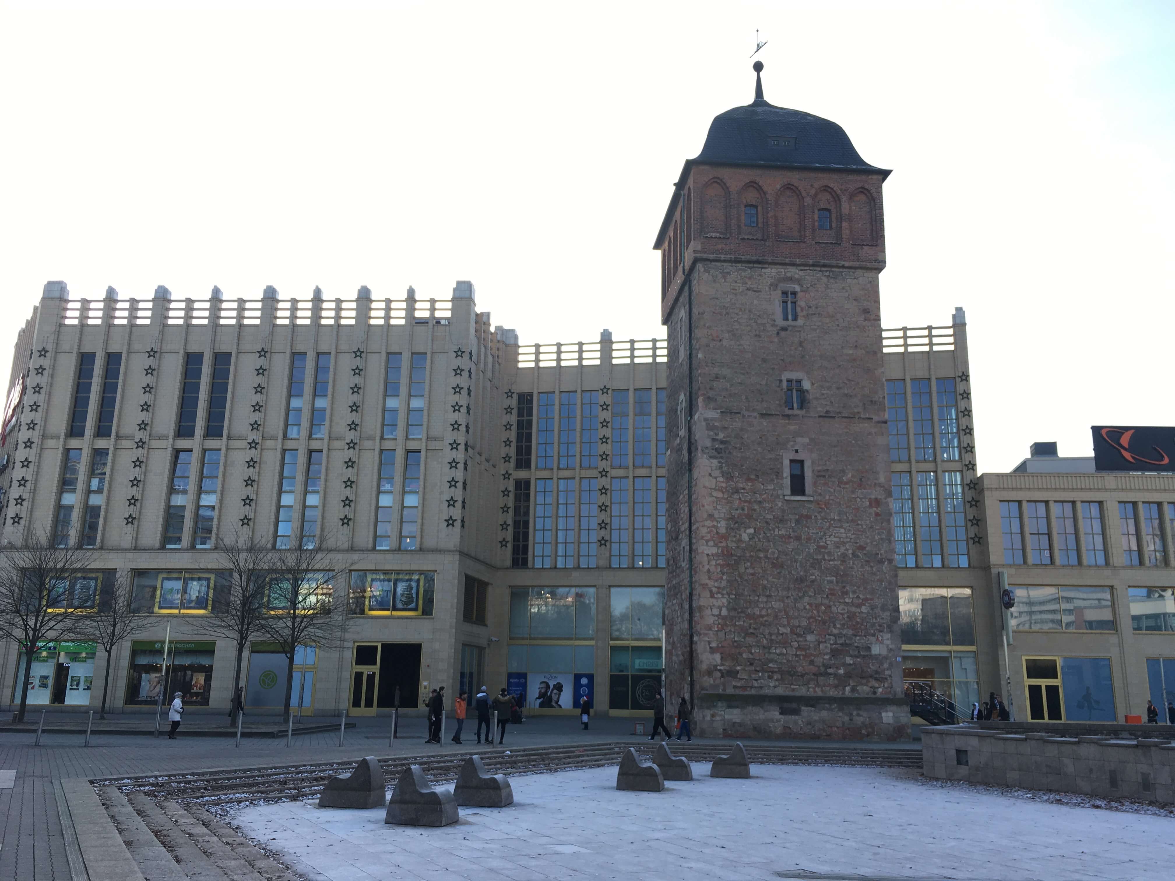 Right opposite the Karl-Marx-Monument is a peculiar plaza with octagonal structures. Not only is the park and its water features octagonal, but the Stadthalle and the adjoining restaurant adjacent to the plaza is also completely composed of octagons. The hotel tower behind the Stadthalle is angled away from the plaza, parallel with its octagonal lines of reference. Perhaps the only thing that existed before the war in this intersection is the 13th century Roter Turm, which is only popular with locals because of a faux Art Deco shopping mall named after it located just 30 meters away, trying hard to fit in.