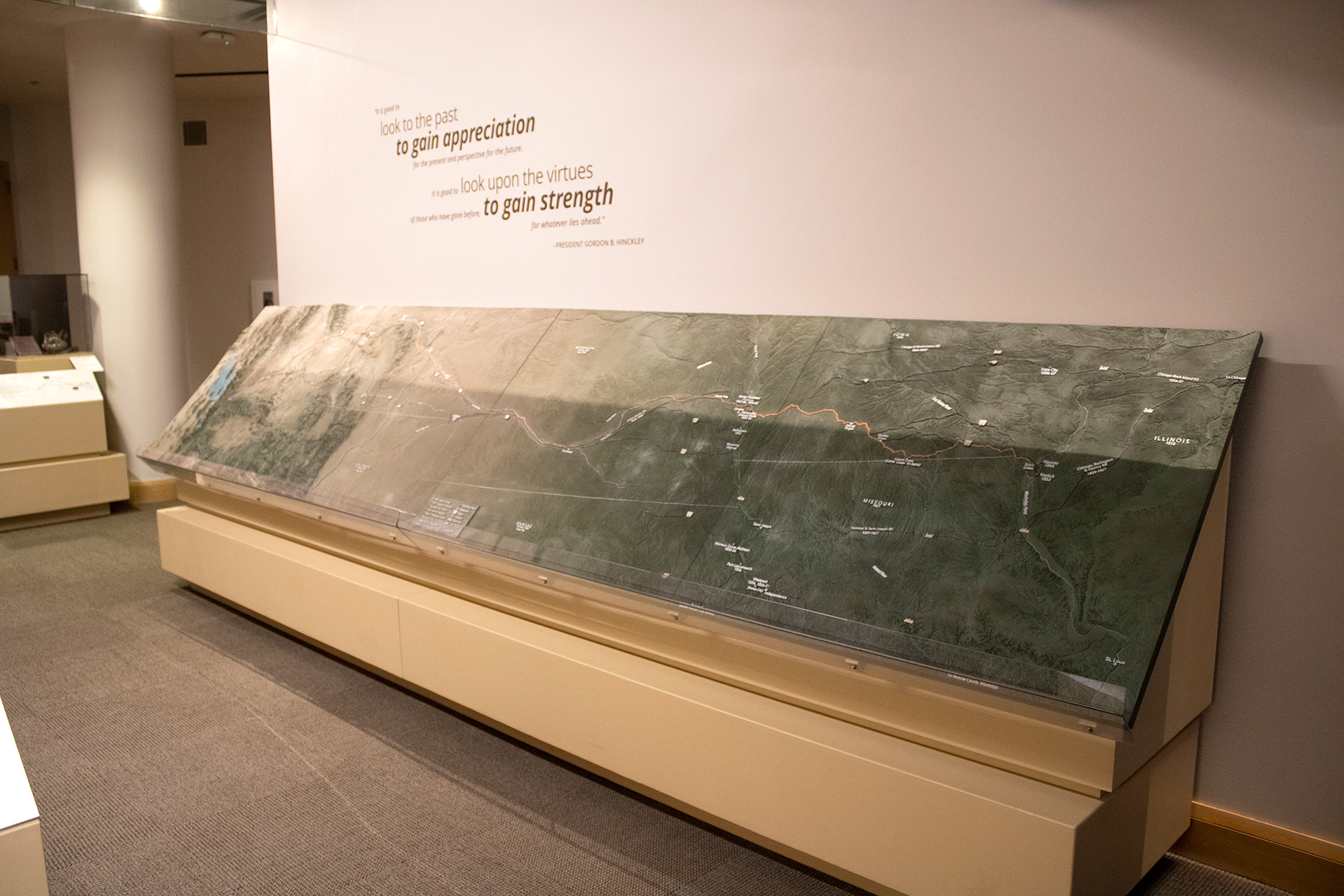 The main gallery tells the history of the religion while the underground gallery displays the paths taken to get from the eastern US to Salt Lake City. There were European converts from Germany and the UK who traveled by sea to New England before reaching Utah by rail.
