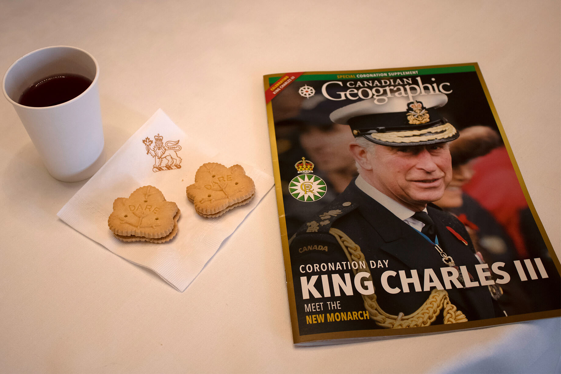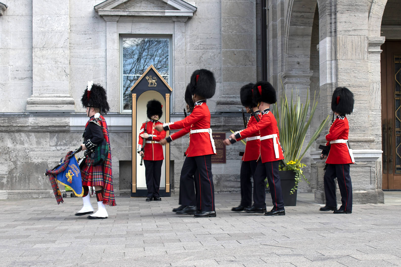 Inside, a military band played Frozen’s theme song Let It Go much to the delight of little children, and a guardsman let the public touch a real bearskin helmet. Uniformed household staff serve visitors tea and maple biscuits all afternoon while they see new coins from the mint, pick up a special edition of Canadian Geographic, and listen to the chief heralder explain the new royal symbols.