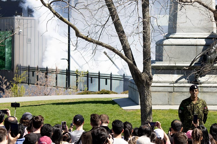 I got back to Parliament Hill in time to see a loud 21-gun salute fired by three howitzers. The way they were pointed at the Ottawa River made it appear as if they were shelling Gatineau on the Quebec side of the river. It would be the first time the redcoats shelled French Canada. When I returned to Rideau Hall, I saw the changing of the guard twice—the military theme ran strong.