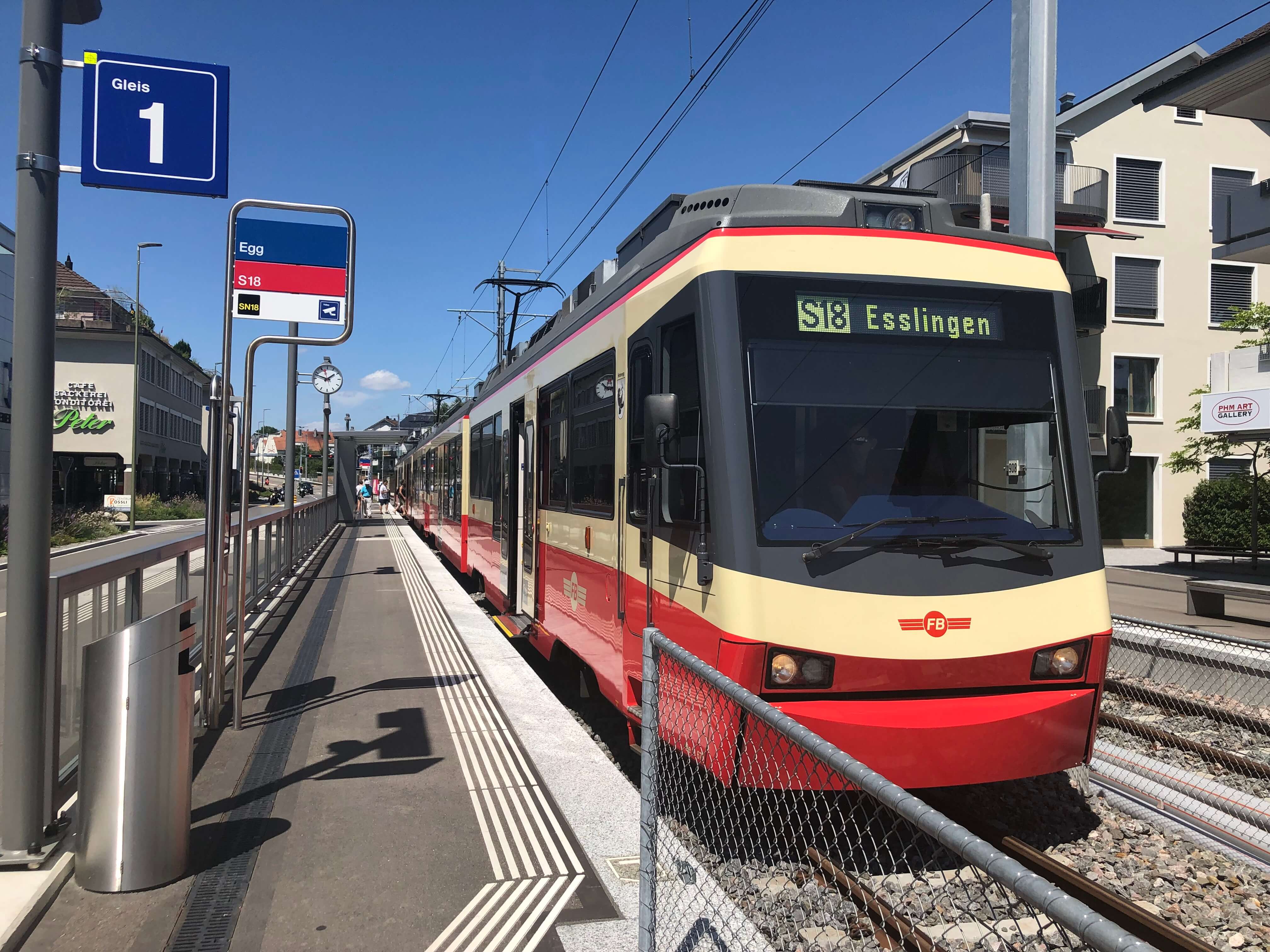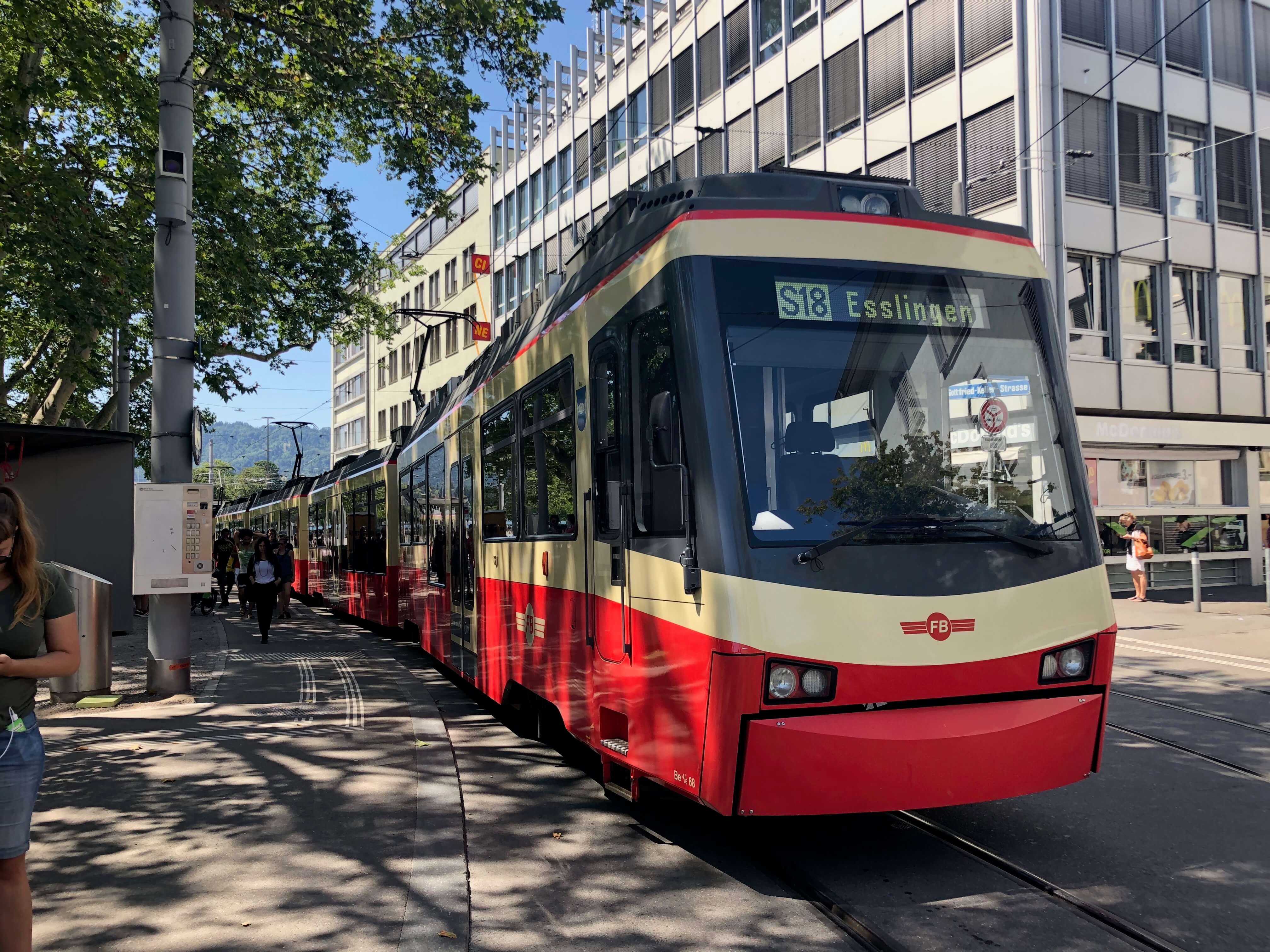 The tram-train called the Forchbahn goes from Zürich to the town of Esslingen to connect the suburbs along the line to jobs in the city. Now known as the S18, it is a part of the ZVV municipal railway network, which makes its fares easy to calculate. The S18 is also my favourite ZVV S-Bahn line because it goes along the ridge on the top of a range of hills offering great views of the valley below.