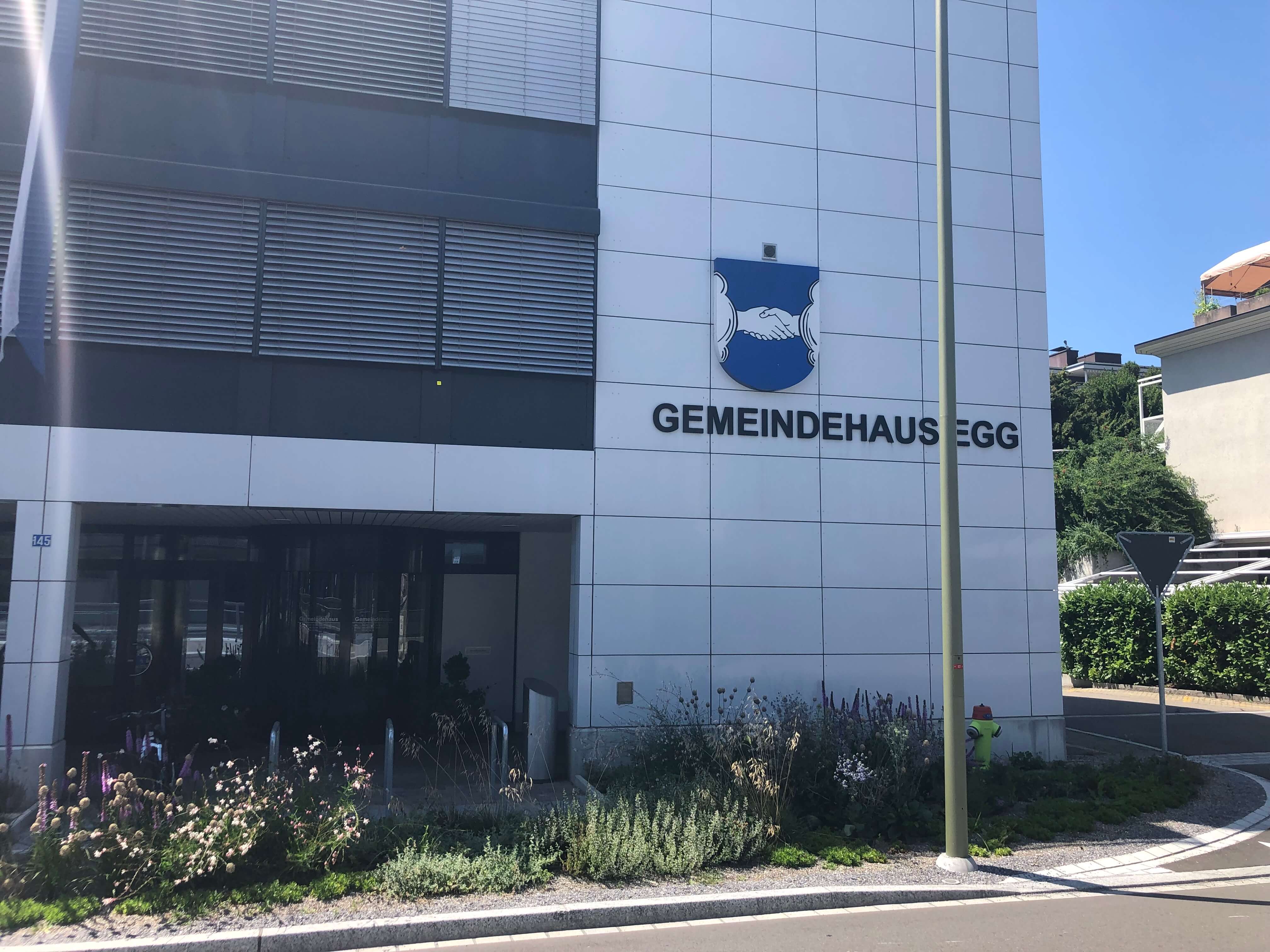 Egg town hall Egg station sign