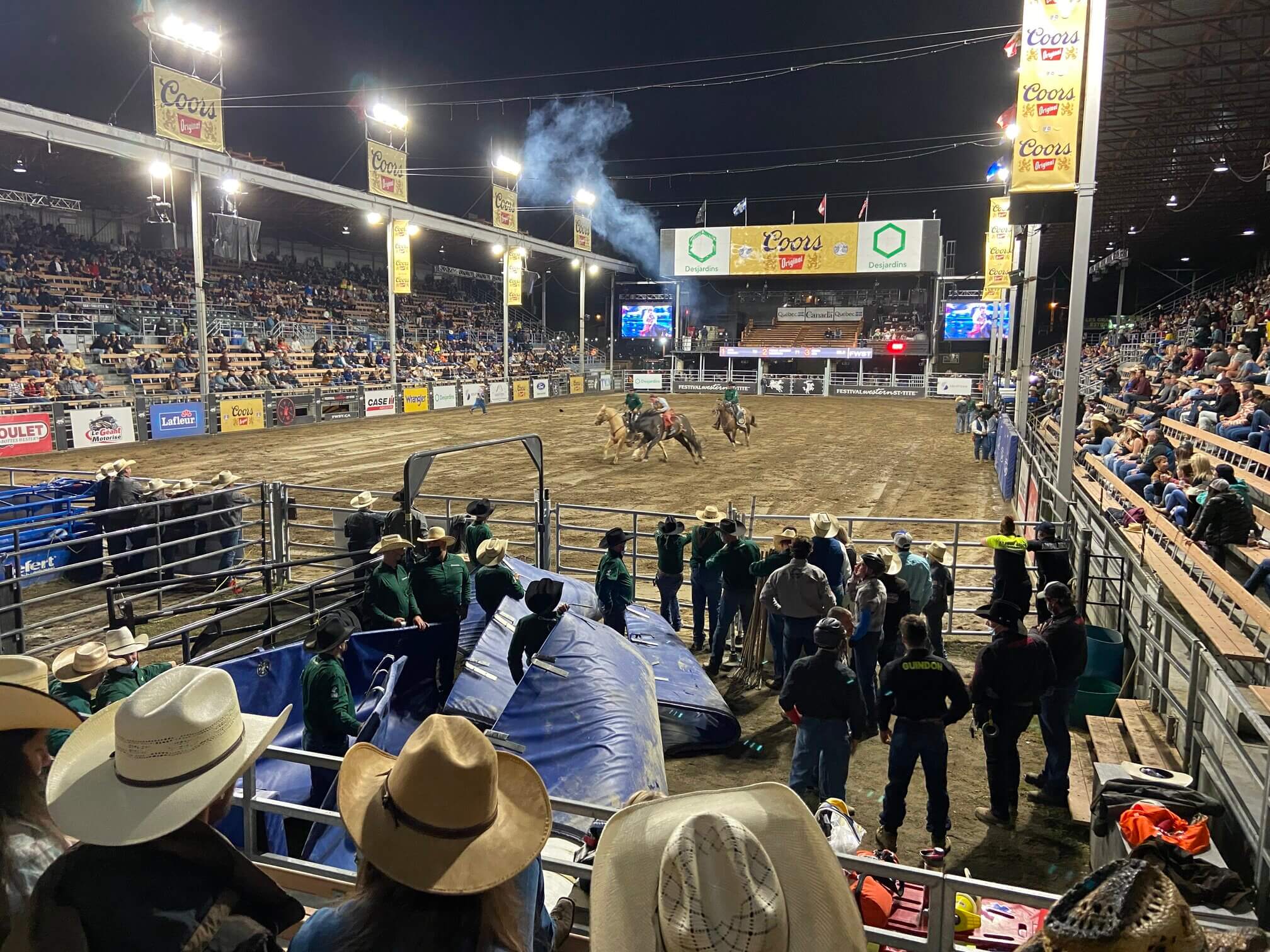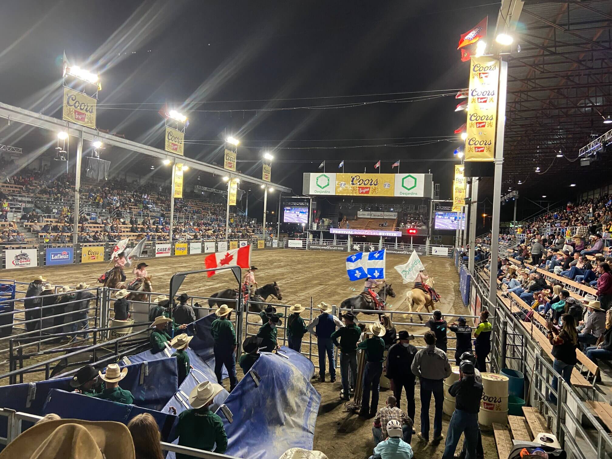 Intermission is a tractor cleaning up the dirt accompanied by a thousand French voices singing along to American western music. After intermission, a couple of non-life-threatening actives begin. There’s riding a horse around three barrels in the fastest time, a mascot riding a pickup truck, and then right back into the wild stuff – bull jumping.