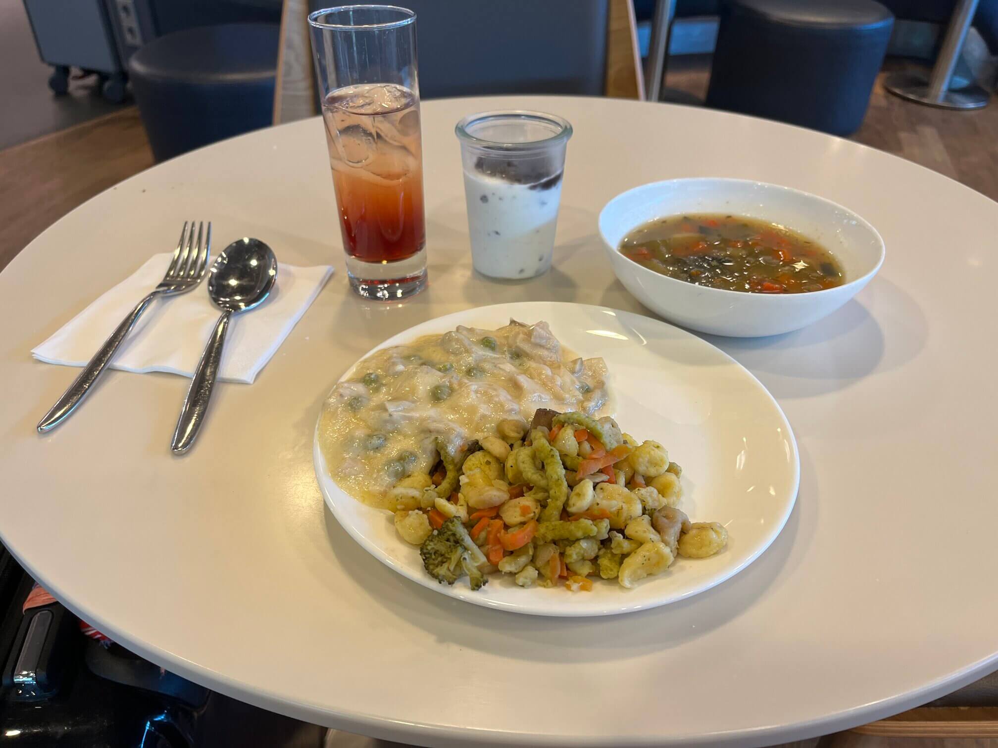 The two business lounges are identically mirrored. This lounge is near the forties gates in terminal B. The only slight difference is in the food offering. While the lounge in the east wing had a vegetable soup and chicken a la king, the west lounge had a cream soup and currywurst.