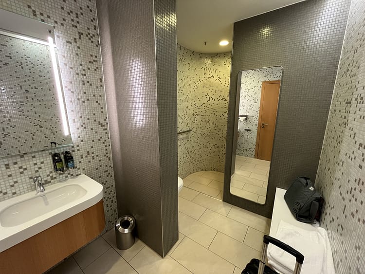 This was the first lounge I had ever left immediately after walking in. The staff enforced the three-hour rule from scheduled takeoff time, not from boarding time like Maple Leaf Lounges in Canada. Showers are available as are a limited number of razor and dental hygiene kits.
