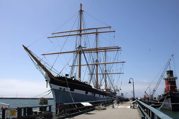 The other big boat here is the Balclutha, built in Scotland in 1886. It was an iron and steel cargo vessel that brought coal from Europe and grain from California until 1903. It made shorter annual trips to Alaska bringing supplies to the frontier state and salmon back south. The ship was part of the Hollywood Navy in the 1930s with fake gun ports painted on one side and used in the background of several films.