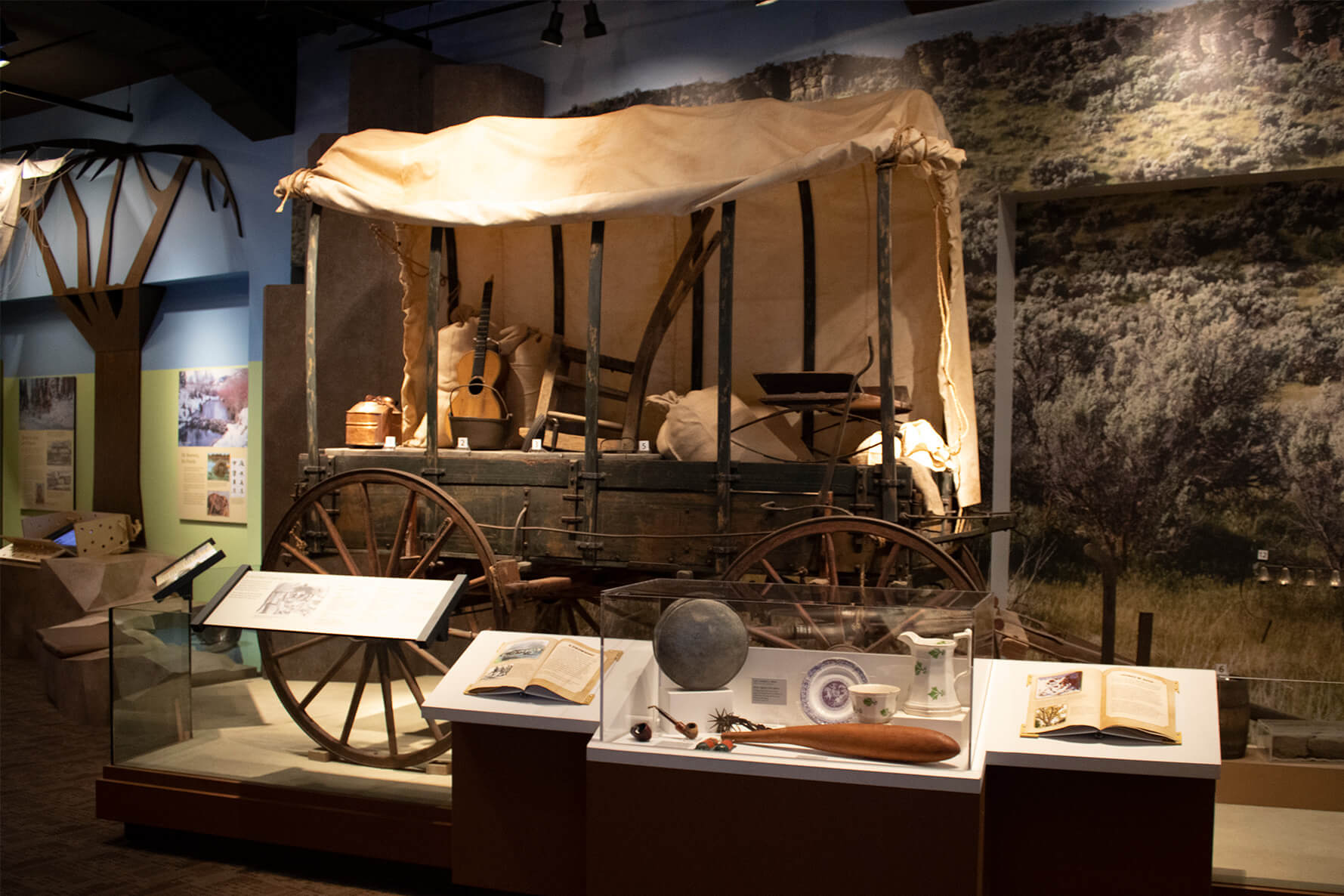 The upper level is on the state’s human history. Emigrants headed out west through the Oregon Trail had to pass through the mountains in Idaho. The migration caused tensions with the Native Americans that led to the Bear River Massacre resulting in over 250 Shoshone deaths, the deadliest in the American West.