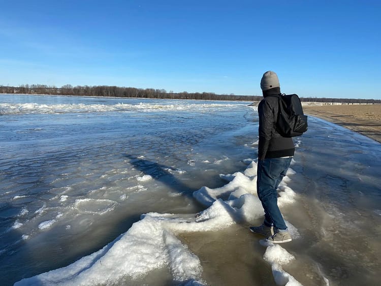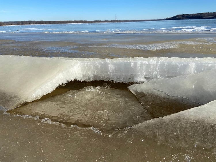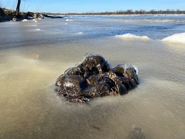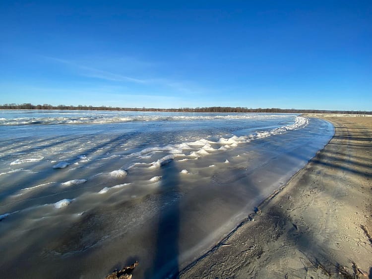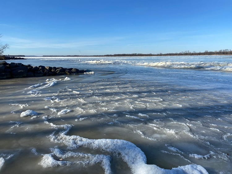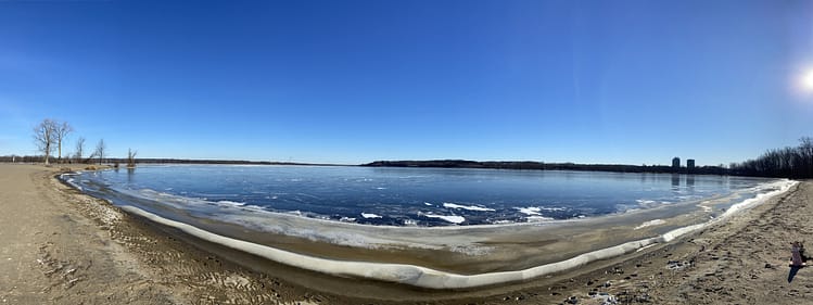 While the rocky and shallow nature of the Ottawa River deters commercial traffic through its waters, being completely frozen over in winter won’t help marine traffic either. Stuemer Park on Petrie Island is a beach on two sides with what looks to be waves frozen in time on the shores.