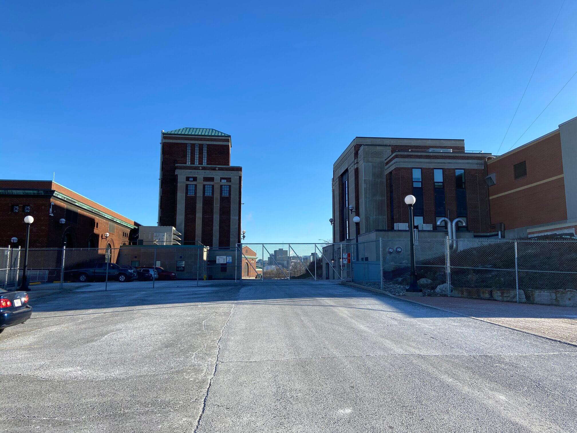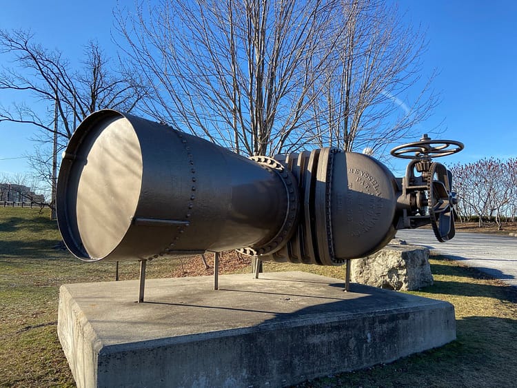 Decommissioned railway bridge at Lemieux Island Water pipes at Lemieux Island Water purification plant at Lemieux Island Valve on display at Lemieux Island