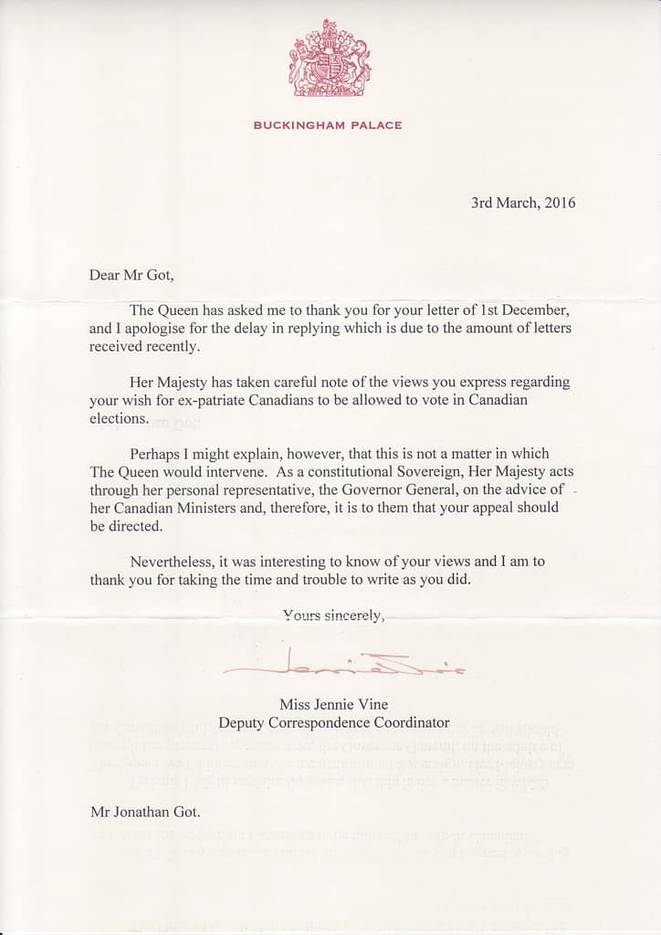 One of Her Majesty’s staff members did reply, stating that Her Majesty’s position as a constitutional monarch means that she wouldn’t intervene. It was suggested that I convey my views to the Governor General of Canada, Her Majesty’s representative. So I did just that.