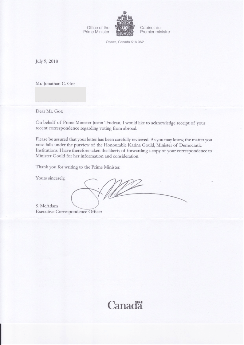 In 2018, I finally got a response from the Prime Minister’s office notifying me that the letter will yet again be forwarded to another department. But that didn’t matter too much because within the next six months, the Supreme Court of Canada would rule in favour of ex-patriate voting rights in Frank v. Canada (Attorney General) – finally restoring the right to vote for all overseas Canadians in accordance with the constitution.