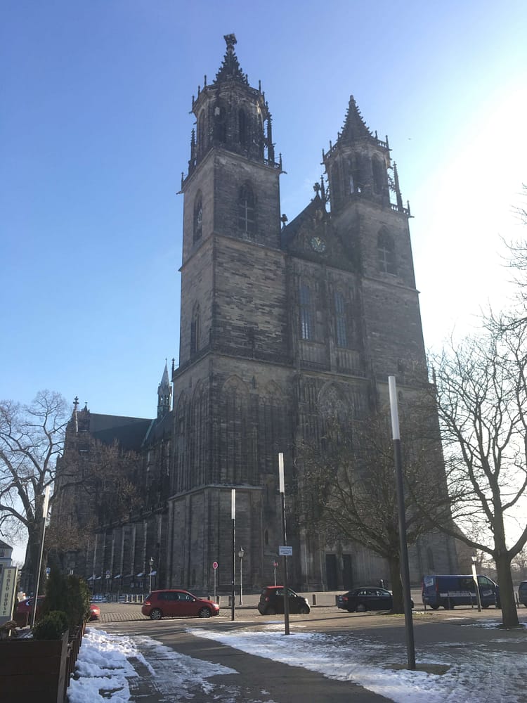 If you look at a large fold-out map of the VBB (Verkehrsberbund Berlin-Brandenburg, the regional transit provider for Berlin and its suburbs), you’ll find Brandenburg on the western end of the map. Travel 90 minutes by train west of that and you’ll get to Magdeburg.