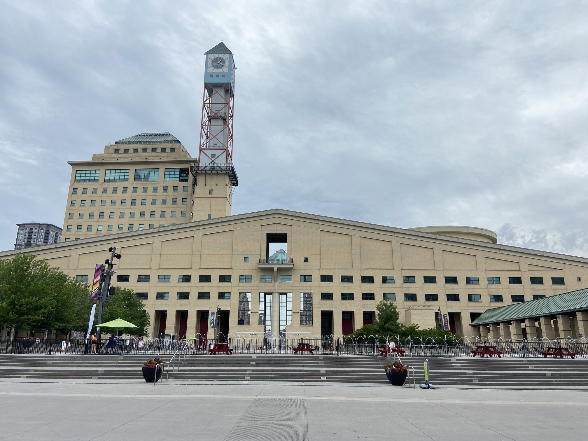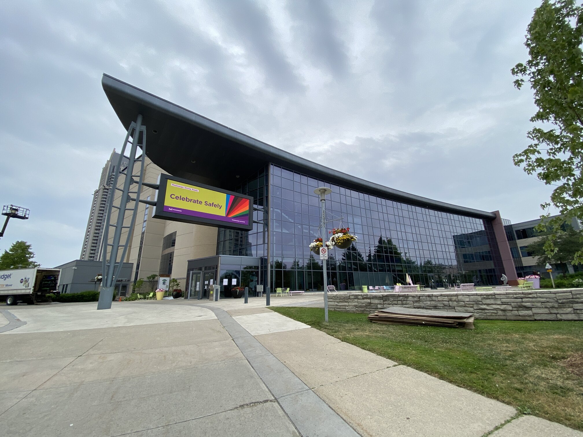 The Mississauga City Hall is also home to the local art gallery. Celebration Square in front of the city hall is a huge wading pool water fountain in summer and converts into an outdoor skating rink every winter. The city hall has a clock tower shaped like a windmill, reminiscent of the many farmsteads that once dotted the area.