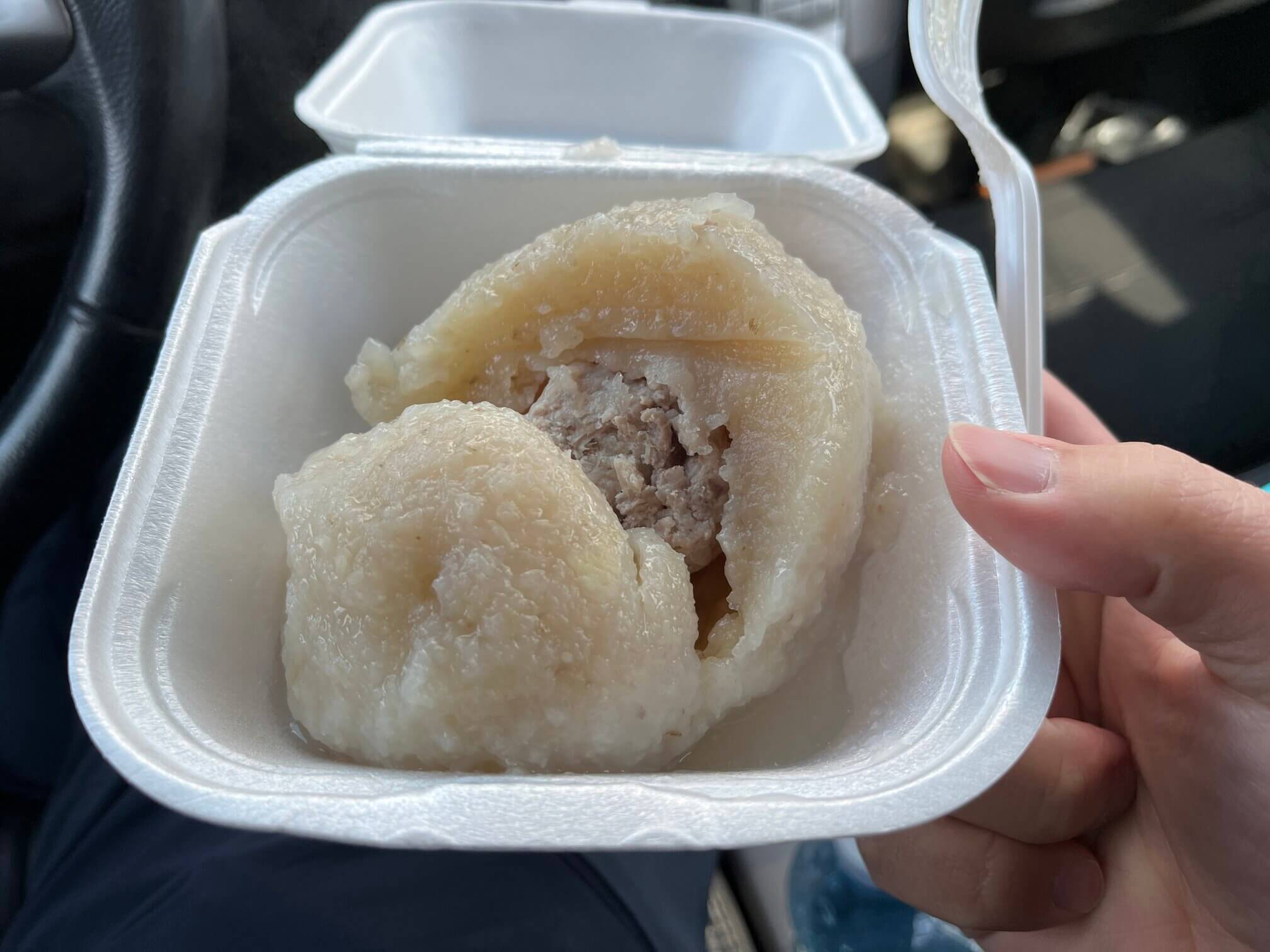 Poutines râpées is a ball of minced pork rolled up inside a thick, chewy layer of coagulated grated potato. It’s almost exactly like German Knödeln. It has to be cooked in boiled water (not boiling) that is left to simmer on very low heat in a covered pot. Leave it in for too long or too hot and it’ll have the consistency of toothpaste, leave it in for not long enough and you’ll end up with lumps of raw potato powder on the inside. It’s a hard art to master – I know because I make it at home.