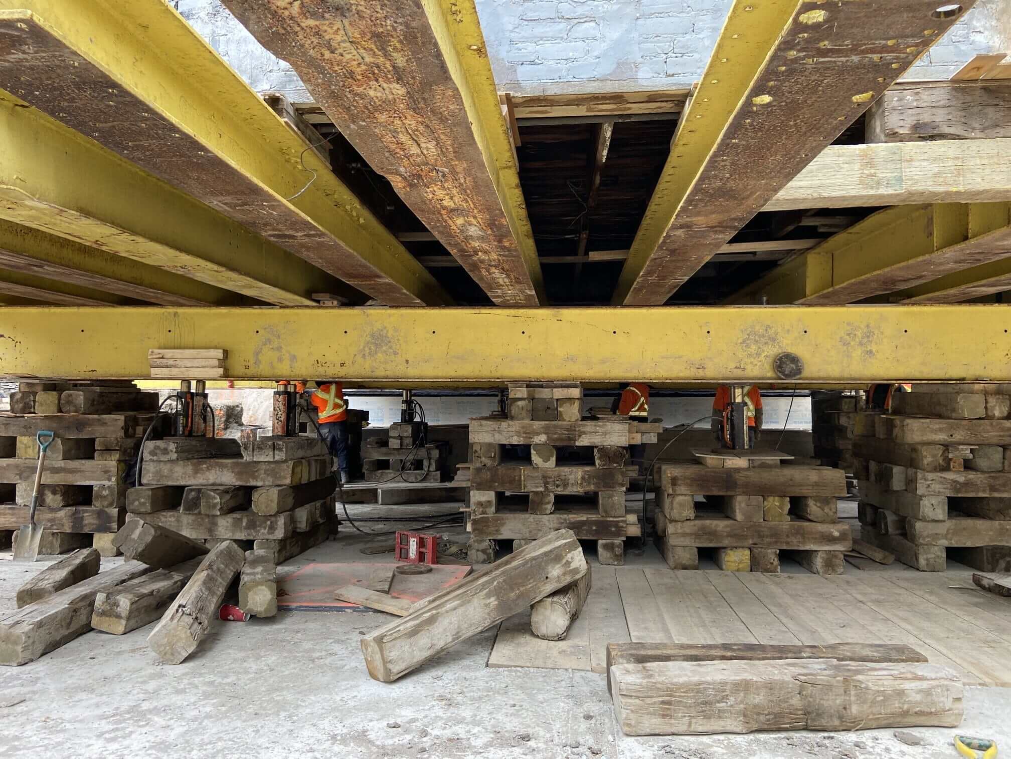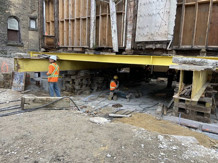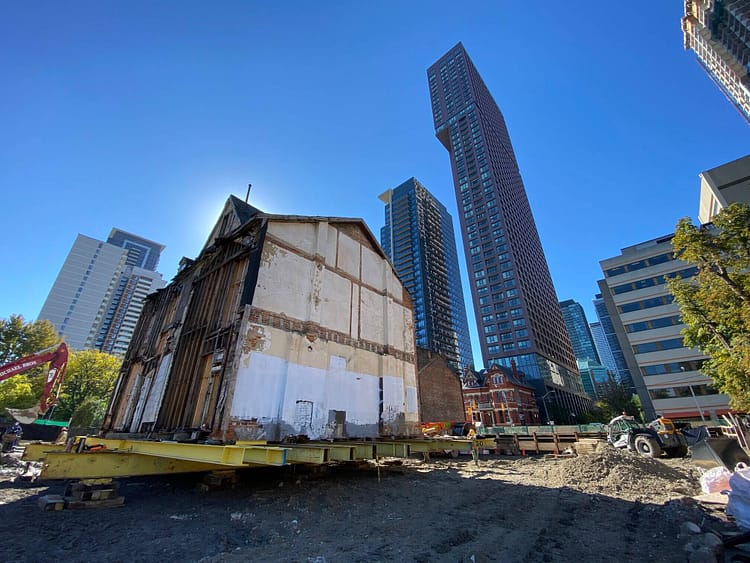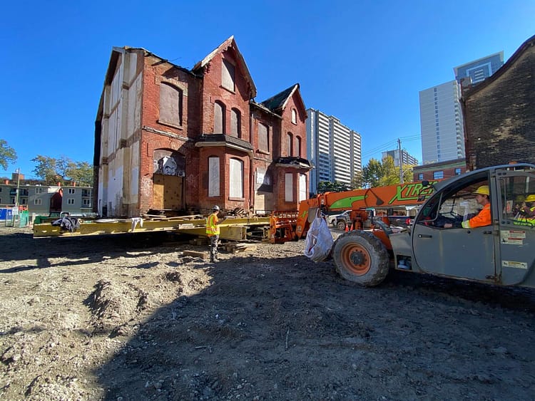 The plans include digging a carpark underneath the Victorian residences, but developers had to move the Sherbourne Street Row Houses out of the way to avoid damage. Workers dug a hole under the row house complex and supported it with giant columns. Then, they gingerly inserted long steel beams between the columns and supported the steel beams with wooden platforms. The red brick building looked like it was hovering on a giant Meccano set.