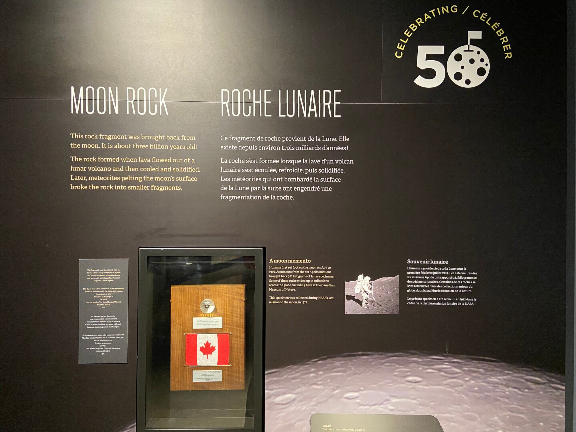 A bonus in the geology exhibit is a display containing a moon rock. It was retrieved by the Apollo 17 mission to the moon in 1972, which was also the last time humans have walked on the moon. During that same mission, a miniature Canadian flag was brought to the moon and back down to Earth.