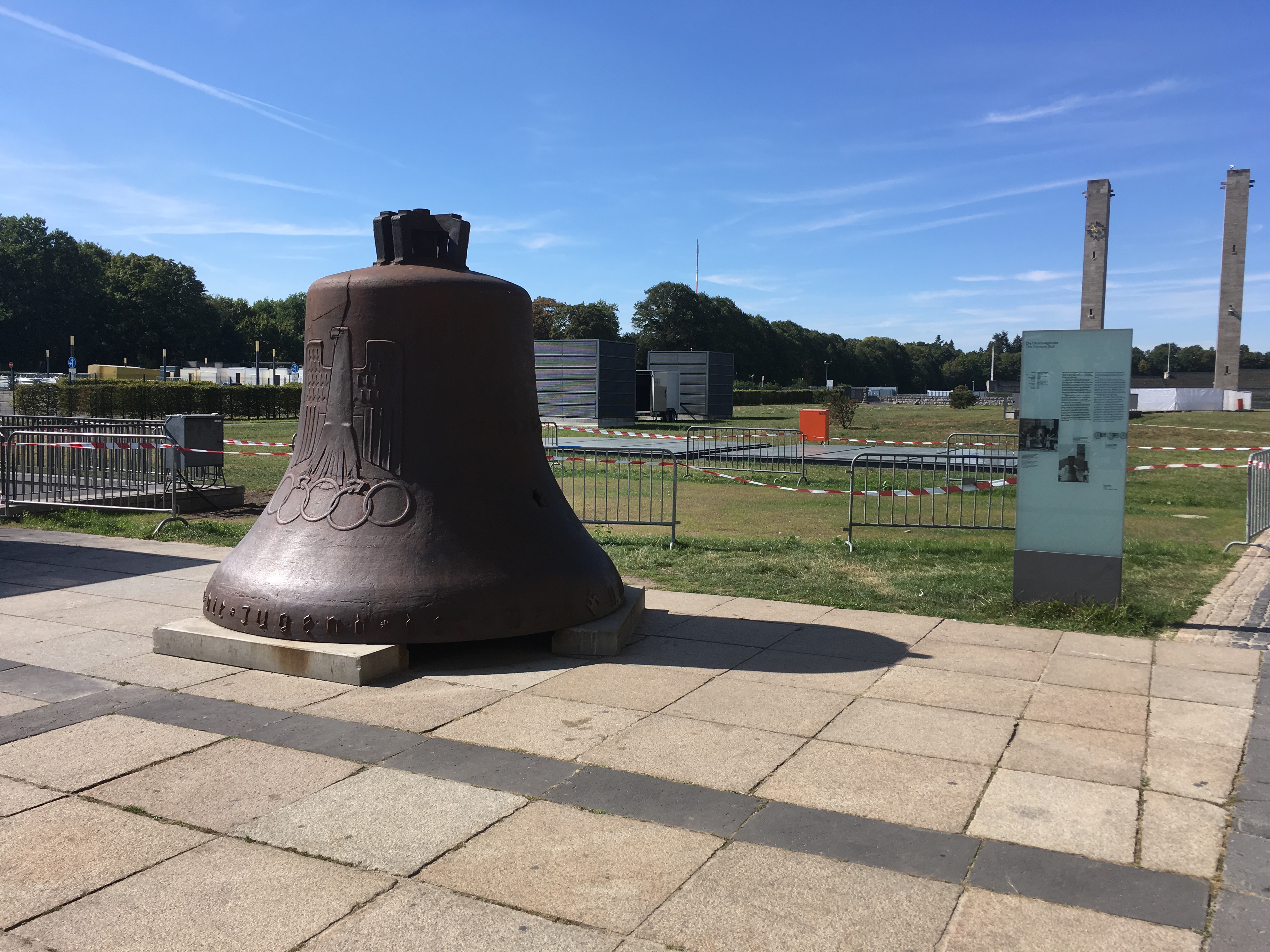 The front gate features a huge Olympic symbol hanging from two towers and the rear of the stadium opens up with the Glockturm clock tower in full view. The Glockturm was destroyed by allied bombing, but was subsequently rebuilt. The original bell with a swastika (hackenkreuz) on it fell to the bottom and survived, and is now on display next to the stadium. The huge complex includes several swimming pools, a Waldbühne Greek-style amphitheatre, among other sports facilities.