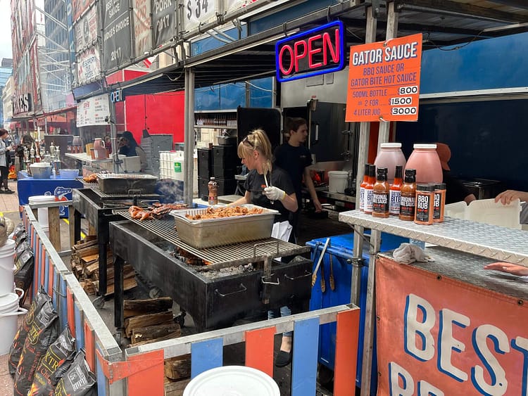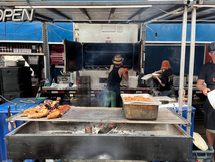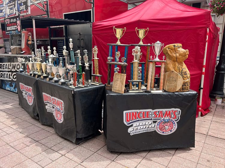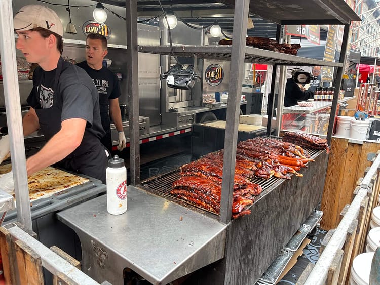 Each stall decorates itself with tables of trophies won at rib competitions around the continent. If that wasn’t enough, the patchwork of canvas signs tells diners exactly when and where they won first place. Roasted corn, soft-serve ice cream, and drinks stalls fill in the gaps but I wouldn’t waste space on my stomach at a rib festival on anything that isn’t meat.