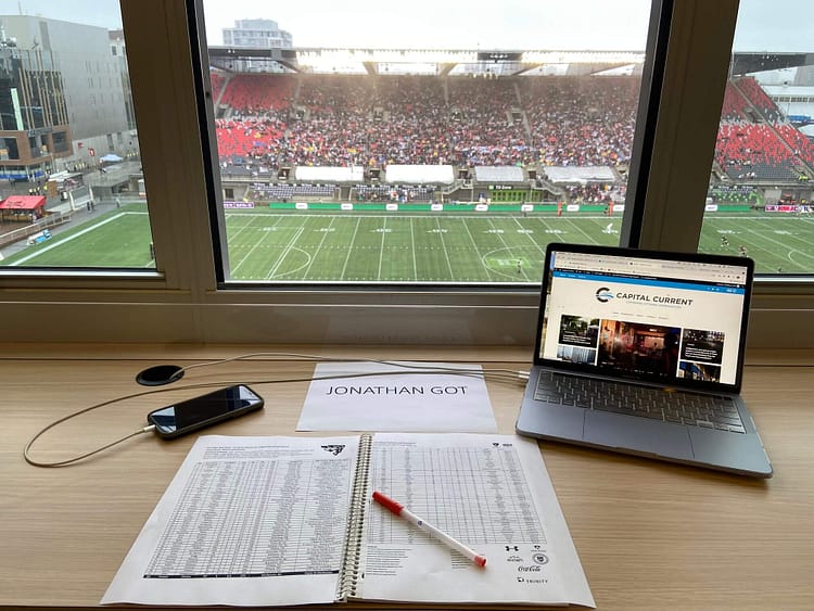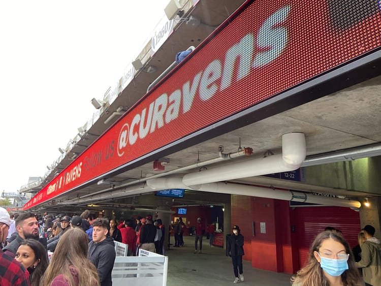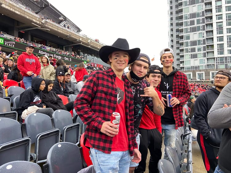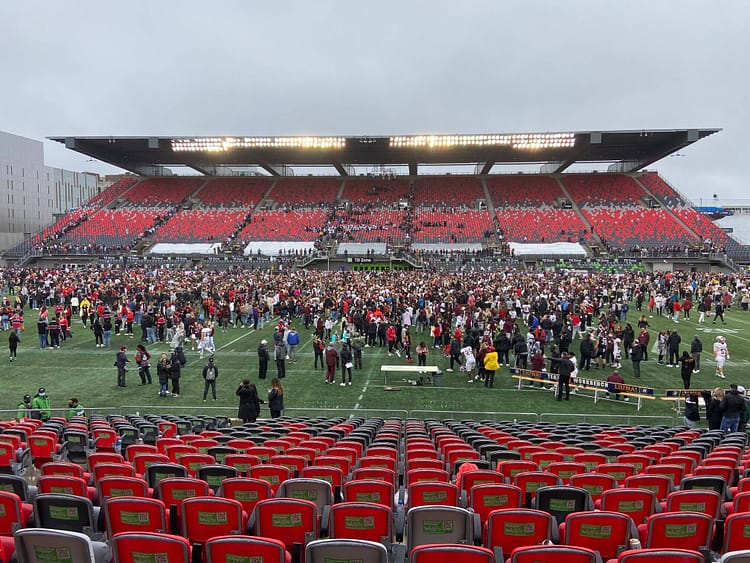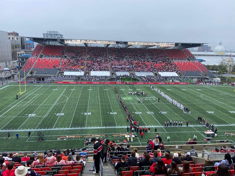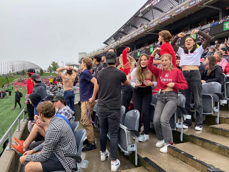 It’s drizzling, then it’s not, then it drizzles again. Two large crowds start forming an hour before the gates open at TD Place Stadium. Gee-Gees fans in garnet and grey spill out from a dozen charter buses at Aberdeen Pavilion while Ravens supporters in red and black step off public buses from Bank Street. Some come in ponchos, others field umbrellas matching their team colours. Those waiting for friends take shelter under shop awnings.