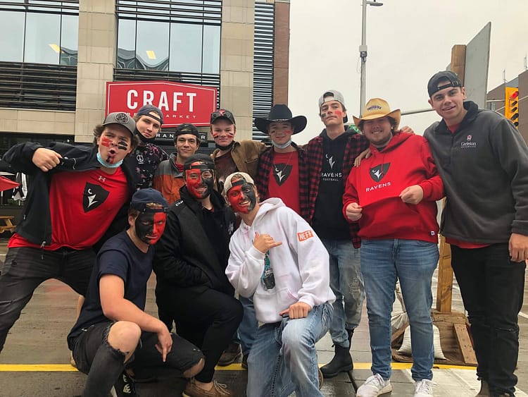 Everyone was raring to go in to support their team. Each side hoped the other would lose. Hugh Russell doesn’t go to Carleton, but he’s “bird gang” because a bunch of his friends study at Carleton. Wearing black and red face paint on both cheeks, his appearance exudes confidence in the Ravens.