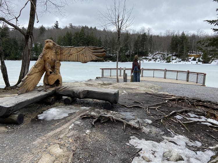 Visitors stay in their car most of the time except to access the tourist village or to hike on one of the trails. One of the longer trails is the Trail of First Nations with carvings and totem poles. There is a floating pathway on the surface of the lake, but it’s closed when the lake is frozen.