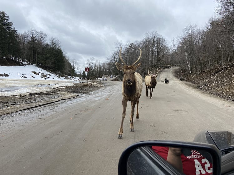 Other animals include caribou, the Rocky Mountain goat, coyotes, raccoons, and turkey. But none of them are really as fun as feeding moose. My trick is to wave the carrot out the window to lure them away from other cars to you for a treat. Then hold them on the hand away from the window so they stretch their head and neck into your car and you can pet them as they eat.