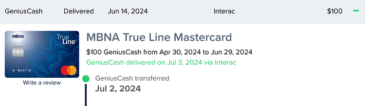 I spotted one such opportunity in June 2024 with the no-fee MBNA True Line credit card and Wealthsimple’s high-interest savings account. While the credit card offered a 0% rate for 12 months with a 3% transfer fee, the savings account was at 4% at the time. CreditCard Genius also offered $100 in cash if applicants used their link to get the MBNA card.